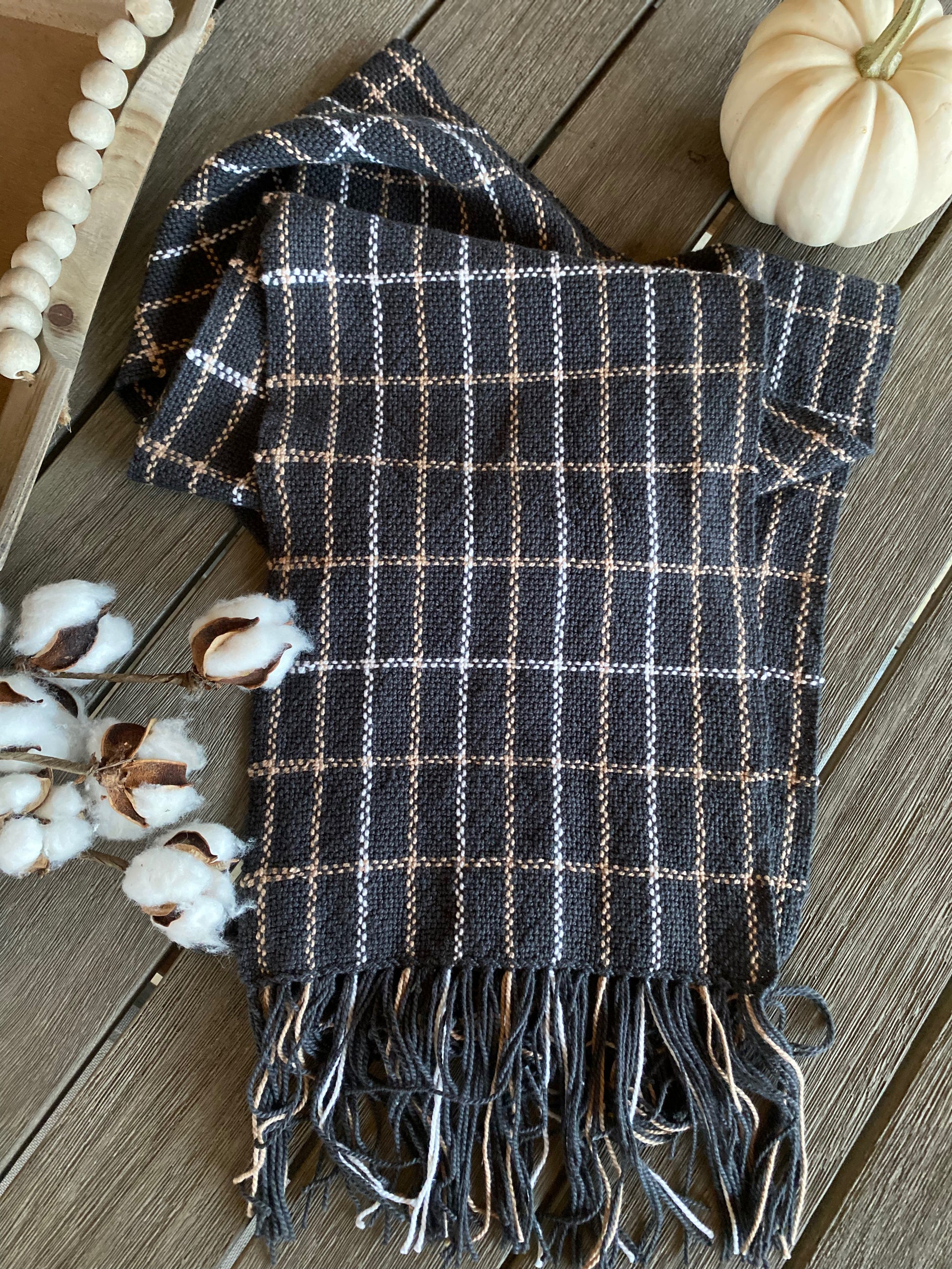 Complete your tablescape with our Charcoal Check Table Runner. Handwoven using 100% organic cotton, this classic table runner is a beautiful charcoal with a natural cream check and toffee beige check throughout. It is the perfect accent piece for farmhouse or beachy home. Measures 9" x 64" with a 3" fringe. Hand wash or machine wash delicate cold; tumble dry low; press with iron as needed.