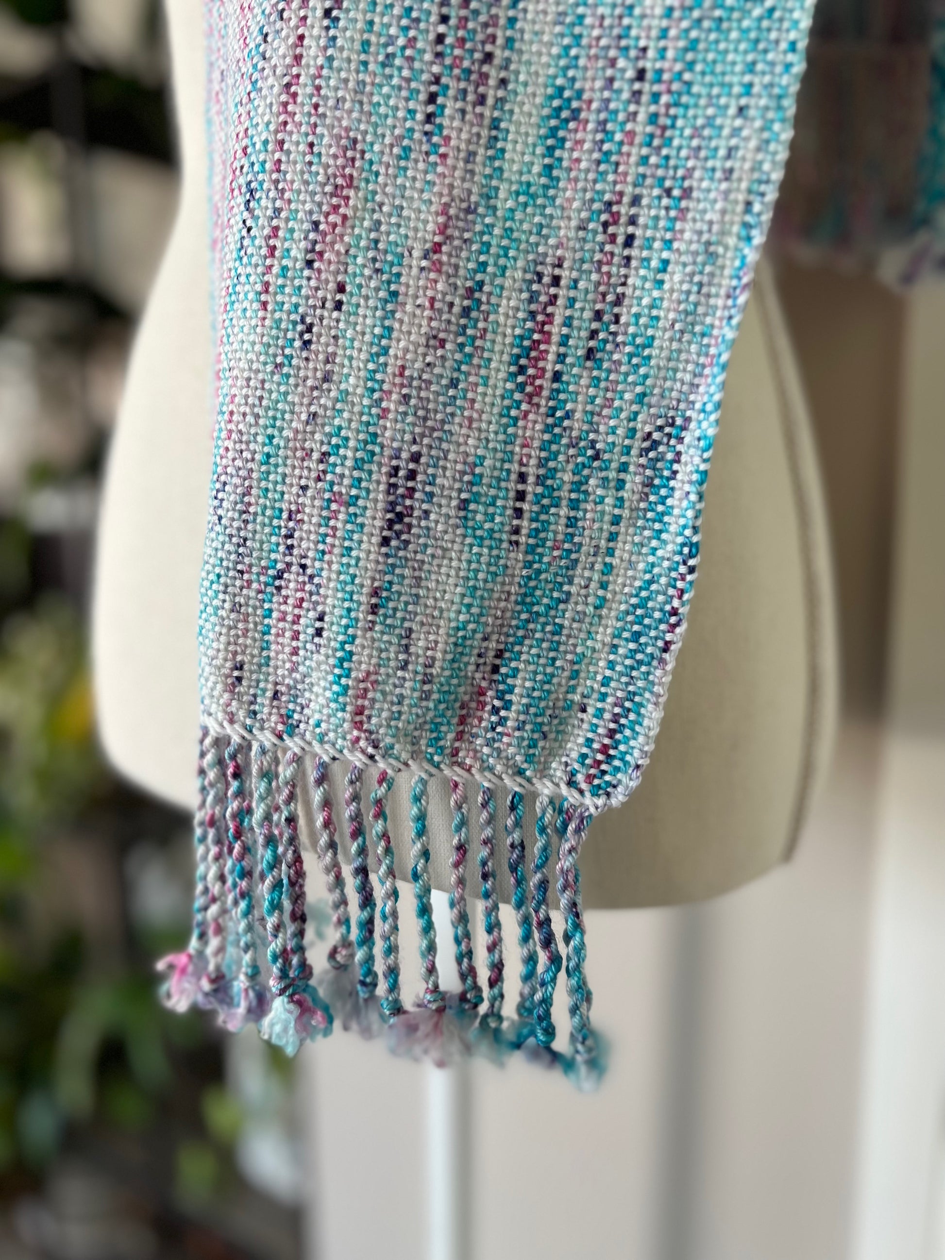 Luxuriously soft and elegant, with a gorgeous drape, this lightweight handwoven scarf was crafted with hand-dyed merino wool, silk and cotton yarns. The custom colorway was created by a local Sarasota, Florida yarn dyer, and features a stunning blend of white, turquoises, pinks and deep purples. This one of a kind scarf is truly wearable art and will attract compliments dressed up or down.