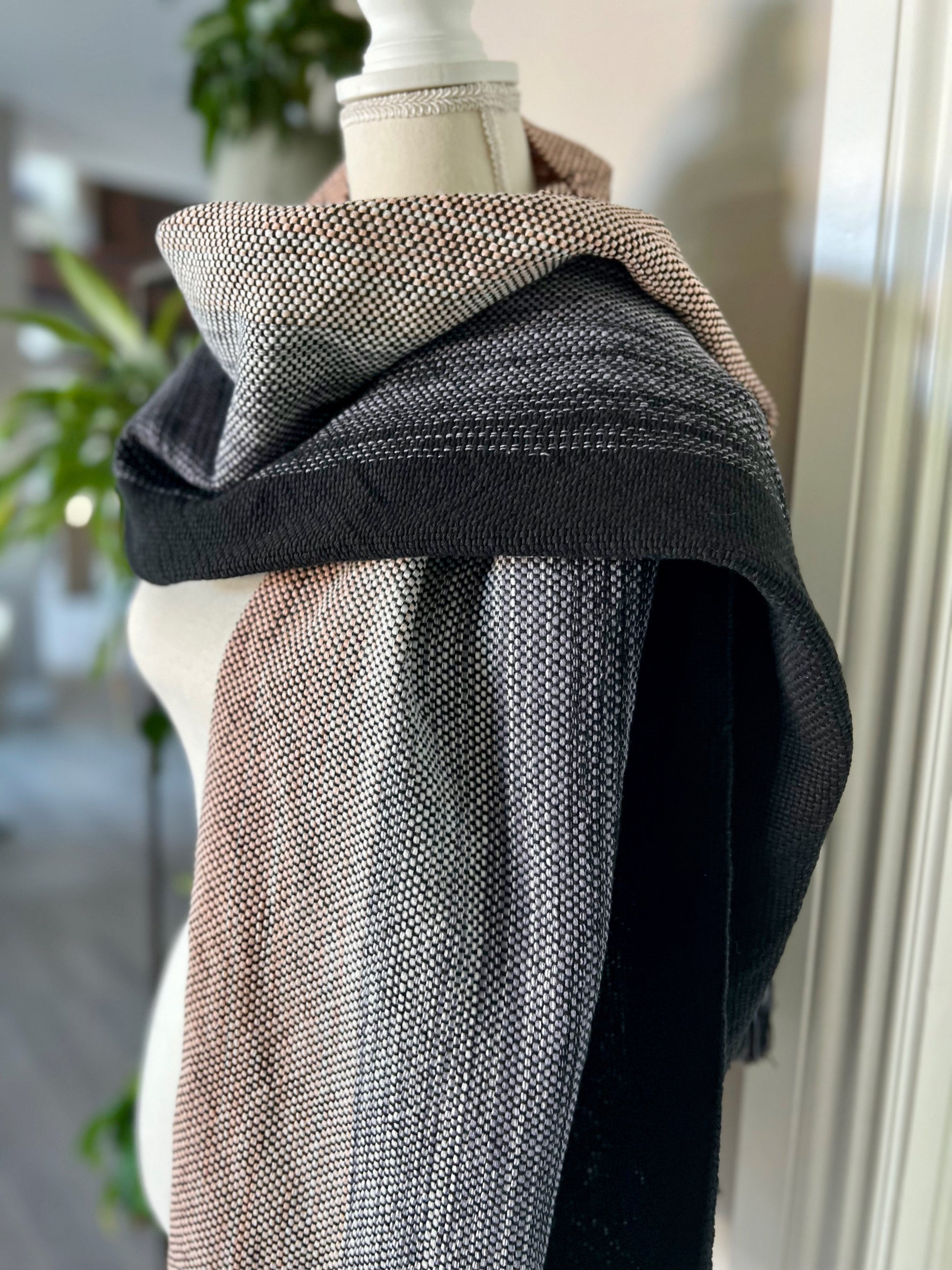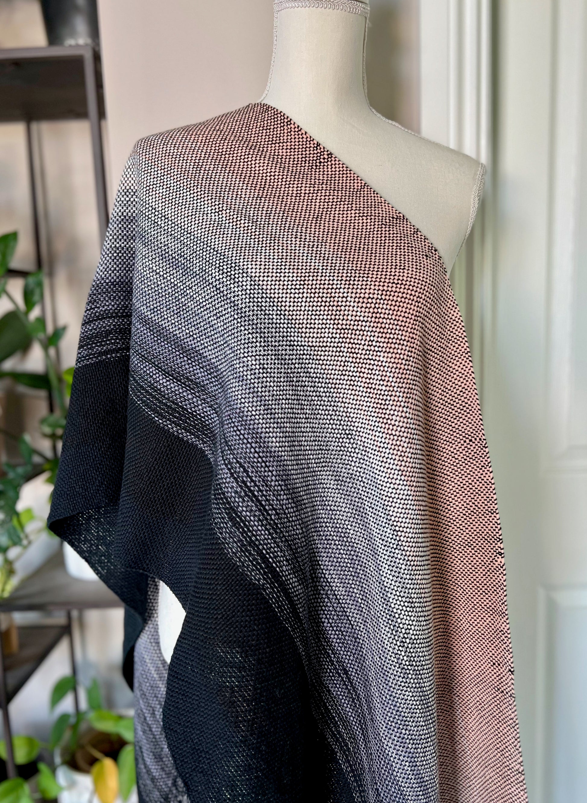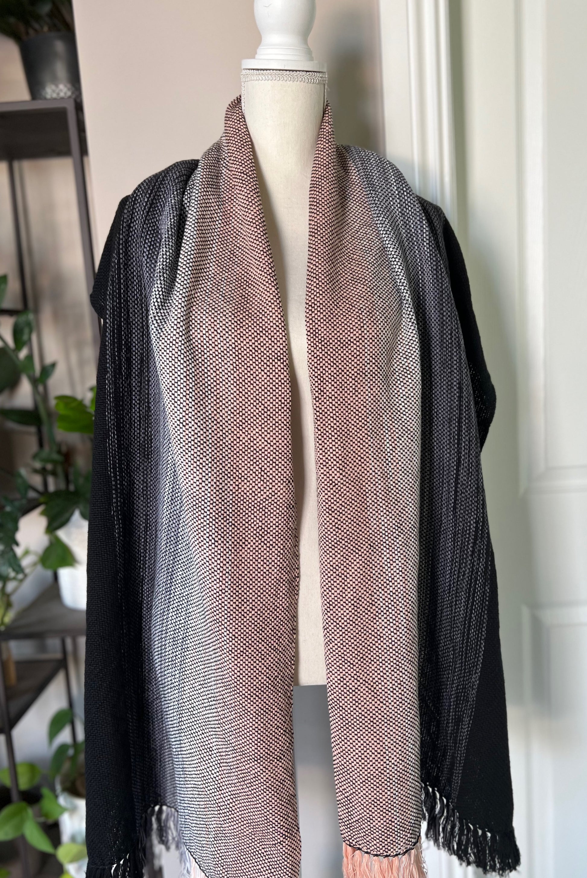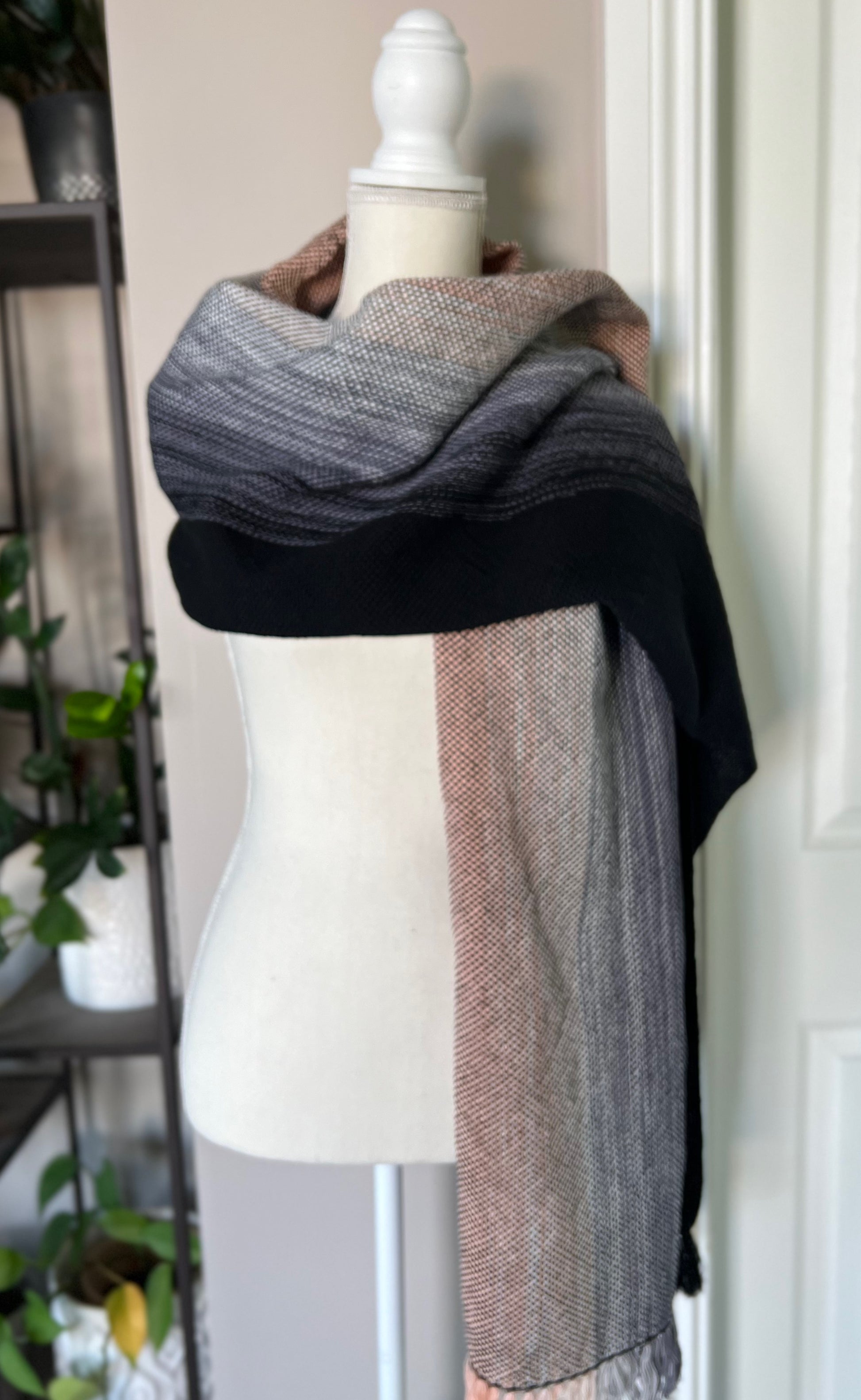 Our Black Swan Wrap brings artfully blended shades of light peach, white, grey and black together in a subtle vertical ombre pattern. The shades are arranged to give you the choice to flaunt the full spectrum of colors or to style the wrap to feature largely black or largely peach. Handwoven with 100% cotton, this all seasons wrap is soft and lightweight.