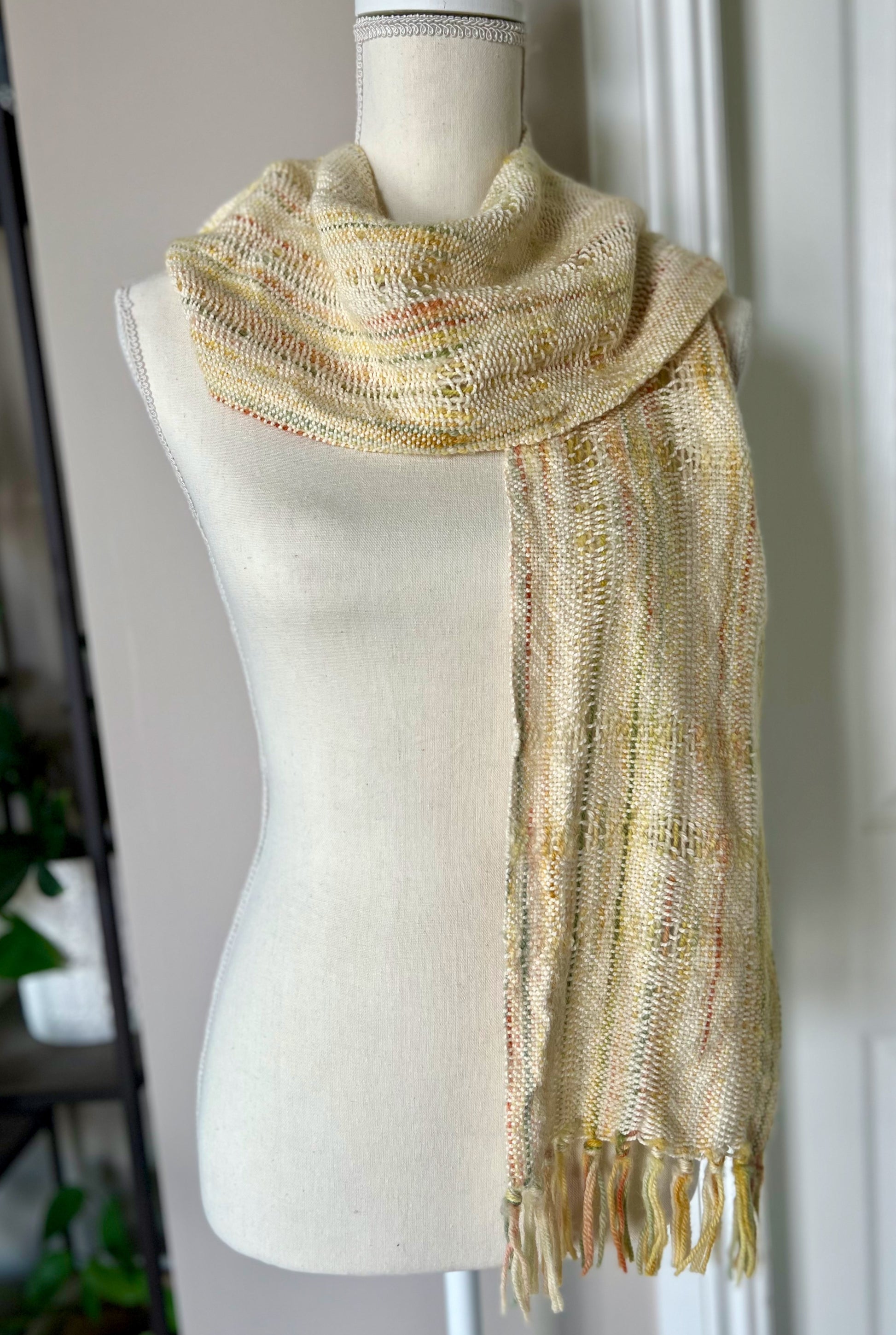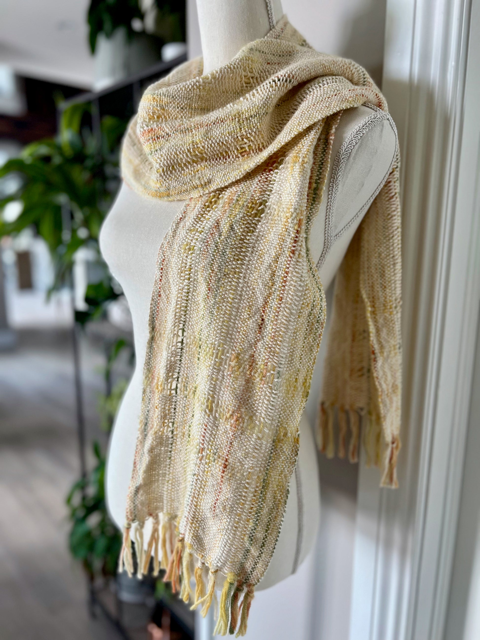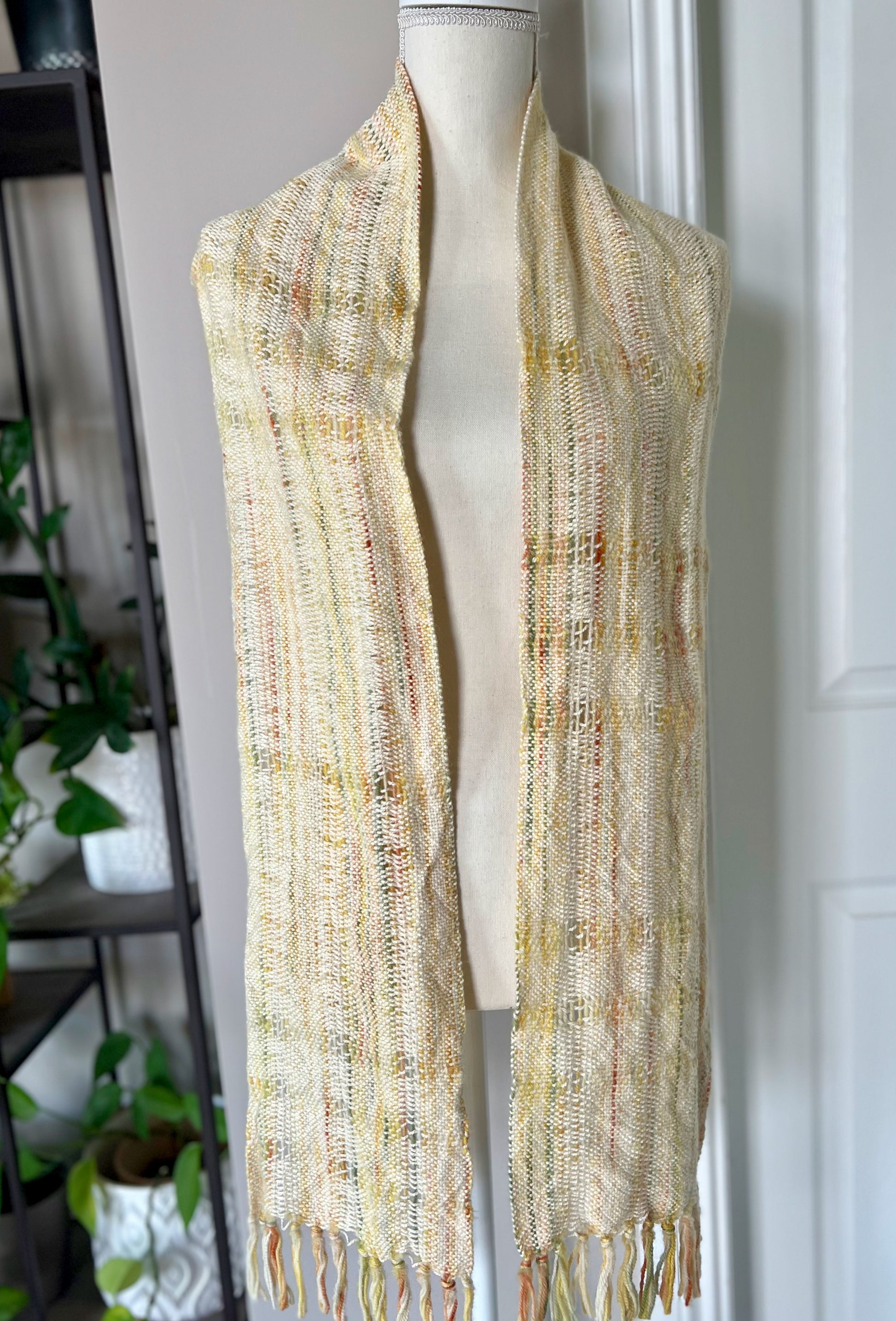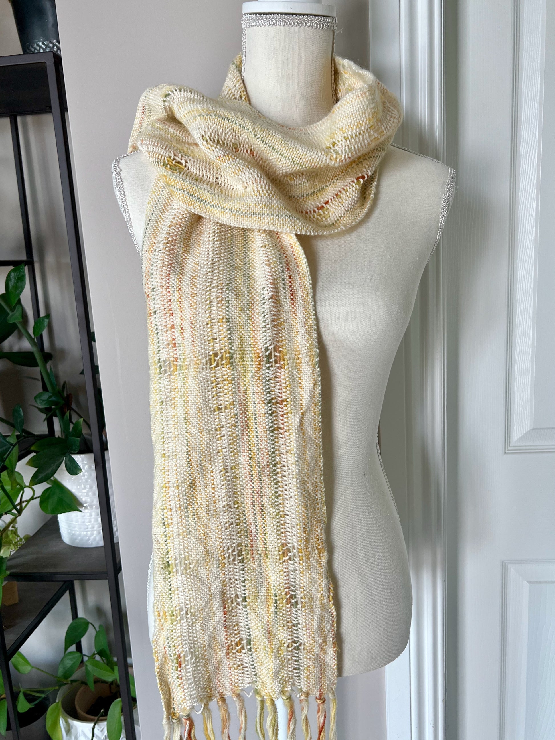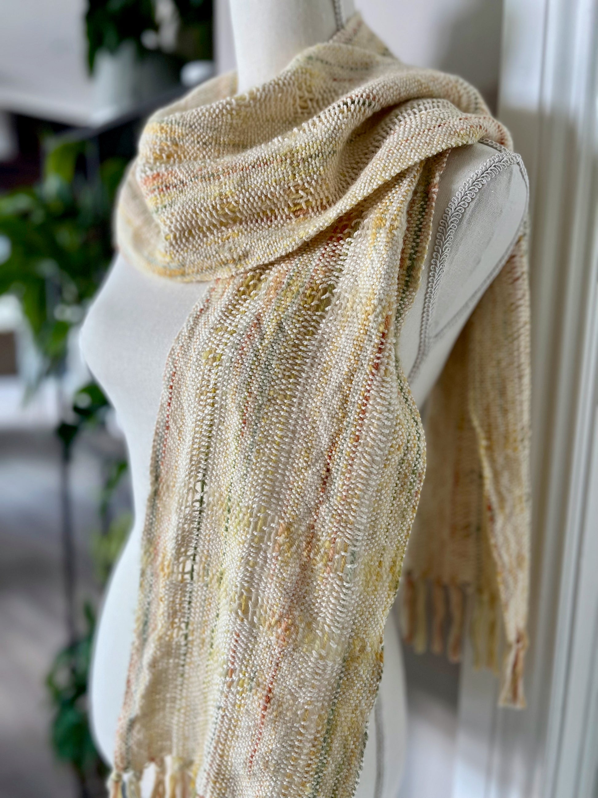 Luxurious and graceful, this lightweight, handwoven scarf captivates with a unique pattern that creates a hint of stripes throughout. Its serene "golden hour" palette of cream, yellow, sage green and orange provide an added element of interest. Constructed from luxurious, hand-dyed baby alpaca and 100% certified organic cotton, this one-of-a-kind scarf can be dressed up or down and will garner admiration every time.