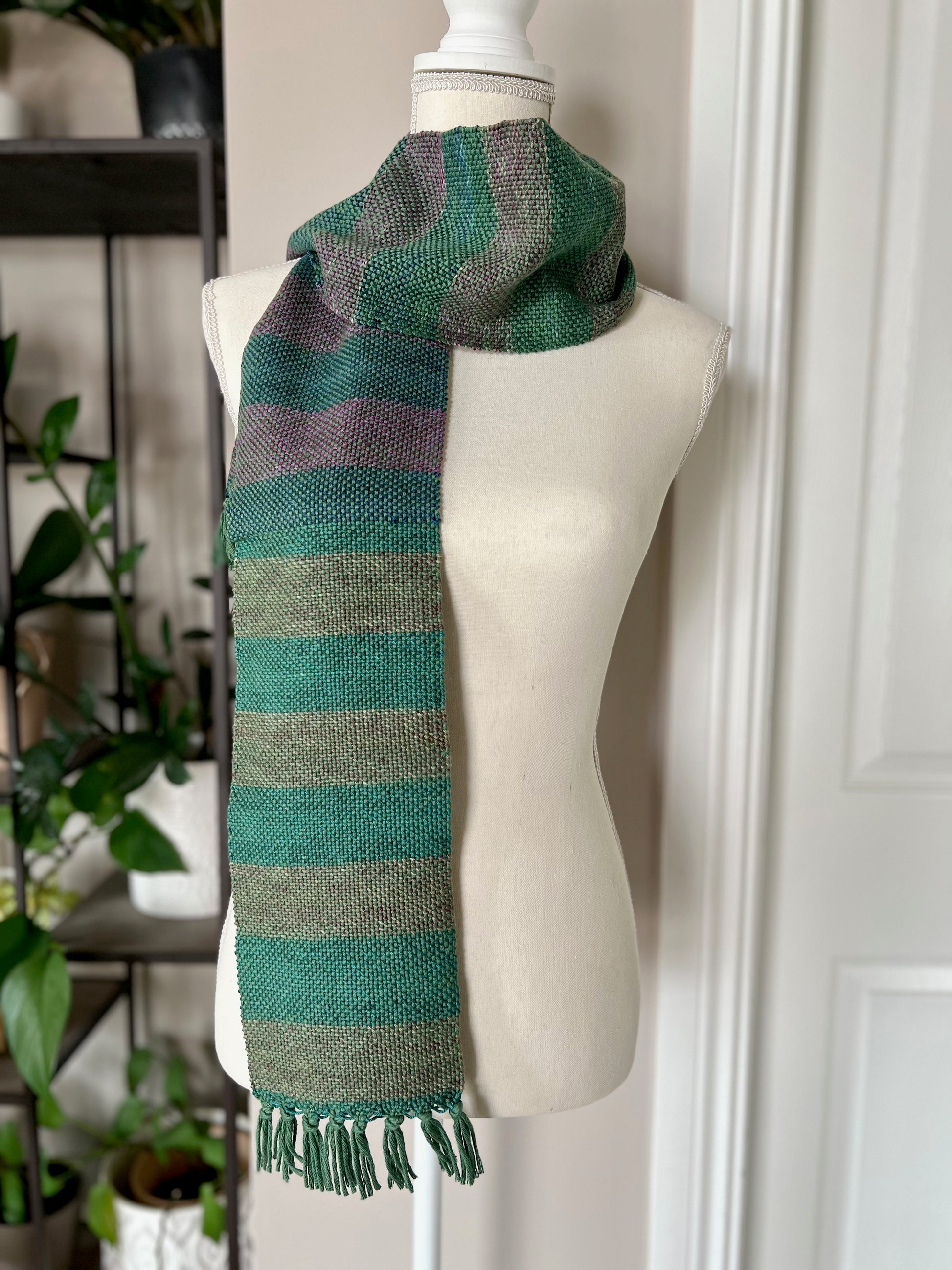 Our Hunter Skinny Striped Scarf brings artfully blended shades of hunter green, blue, gold, brown and purple together in a classic horizontal striped pattern. Handwoven with hand-dyed cotton yarn, this one-of-a-kind unisex scarf is incredibly soft and lightweight.