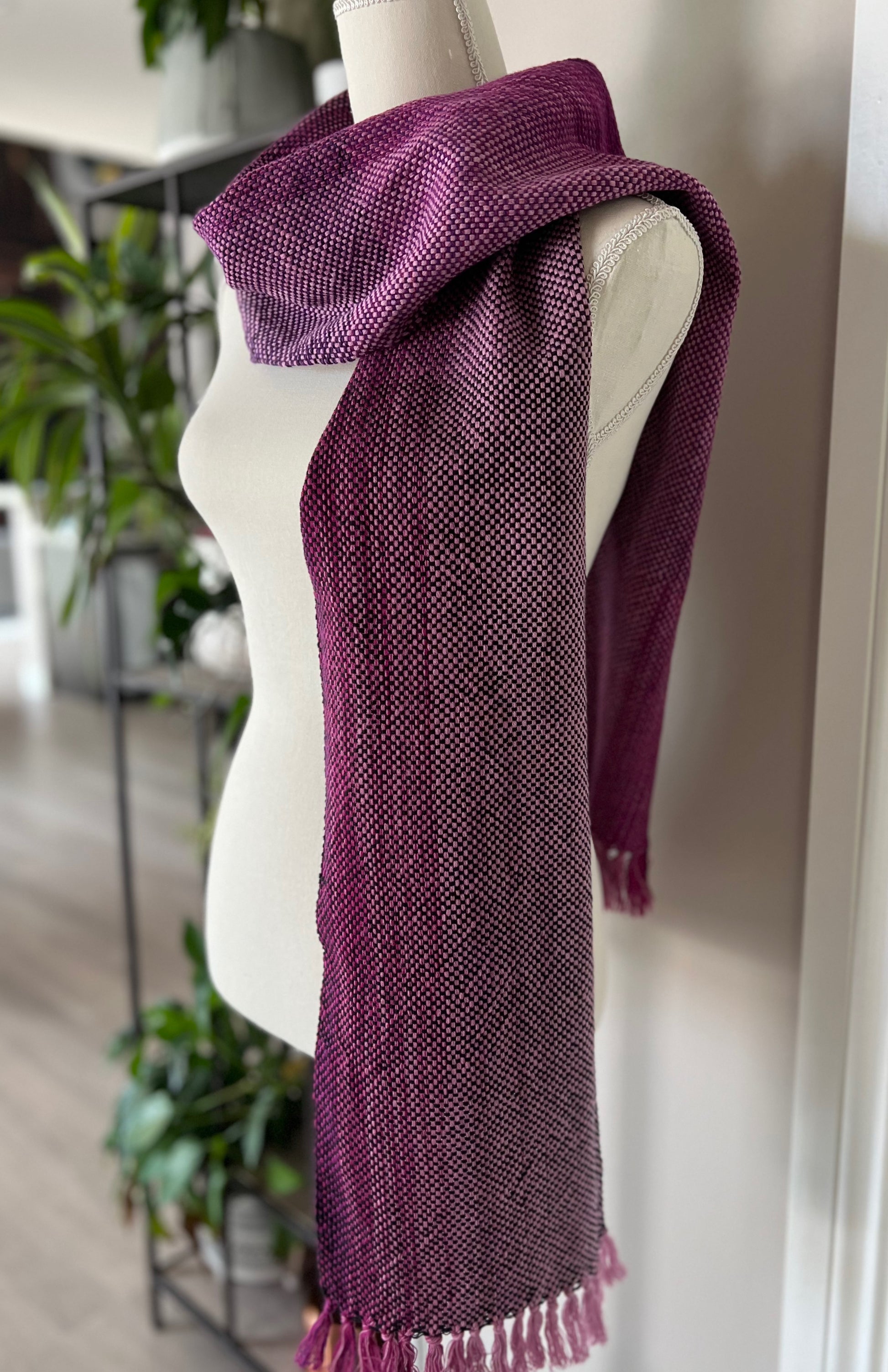 Our Dark Orchid Scarf brings artfully blended shades of purples, plums and black together in a subtle vertical ombre pattern. Handwoven with 100% cotton, this all seasons scarf is soft and lightweight.