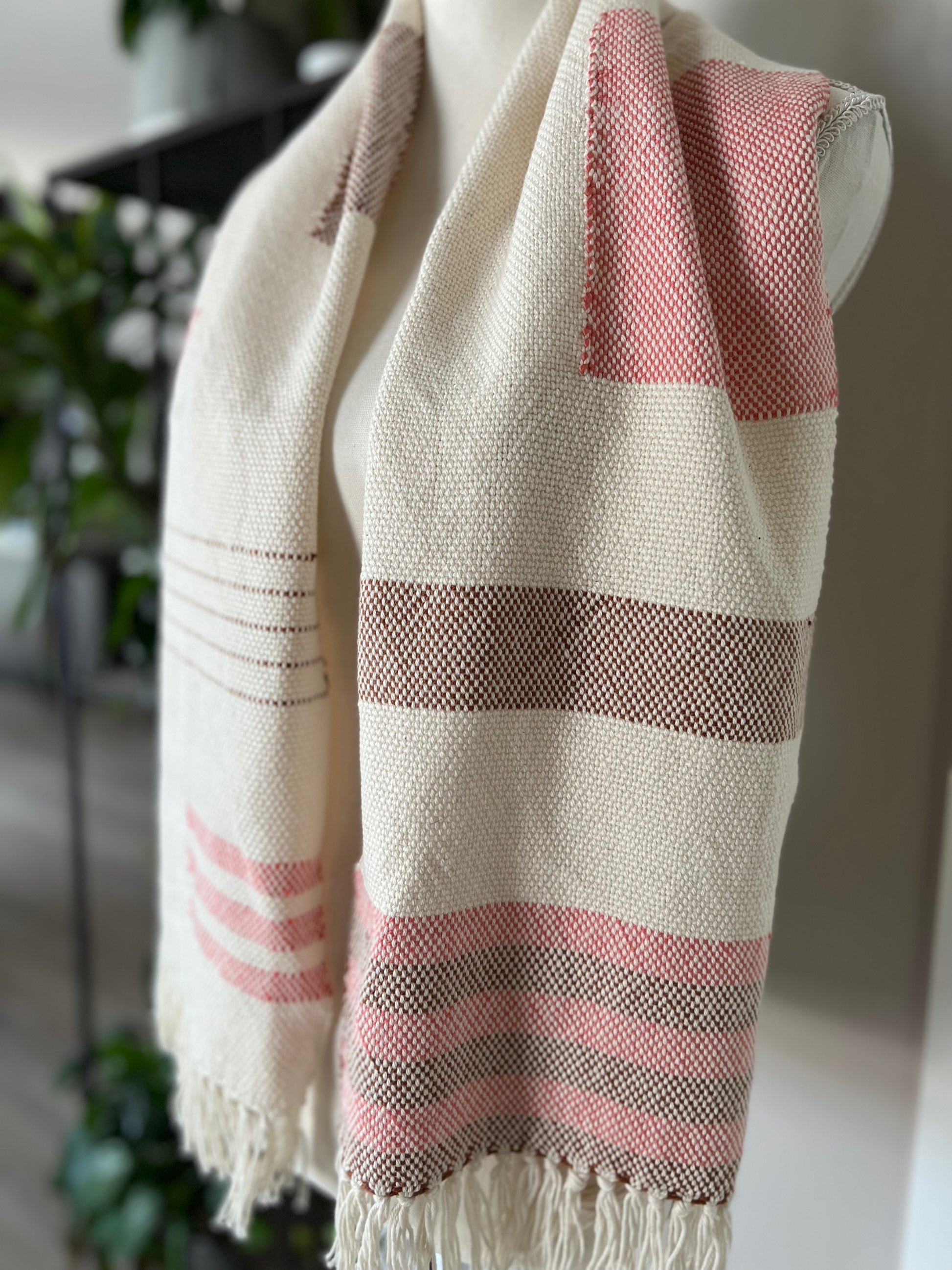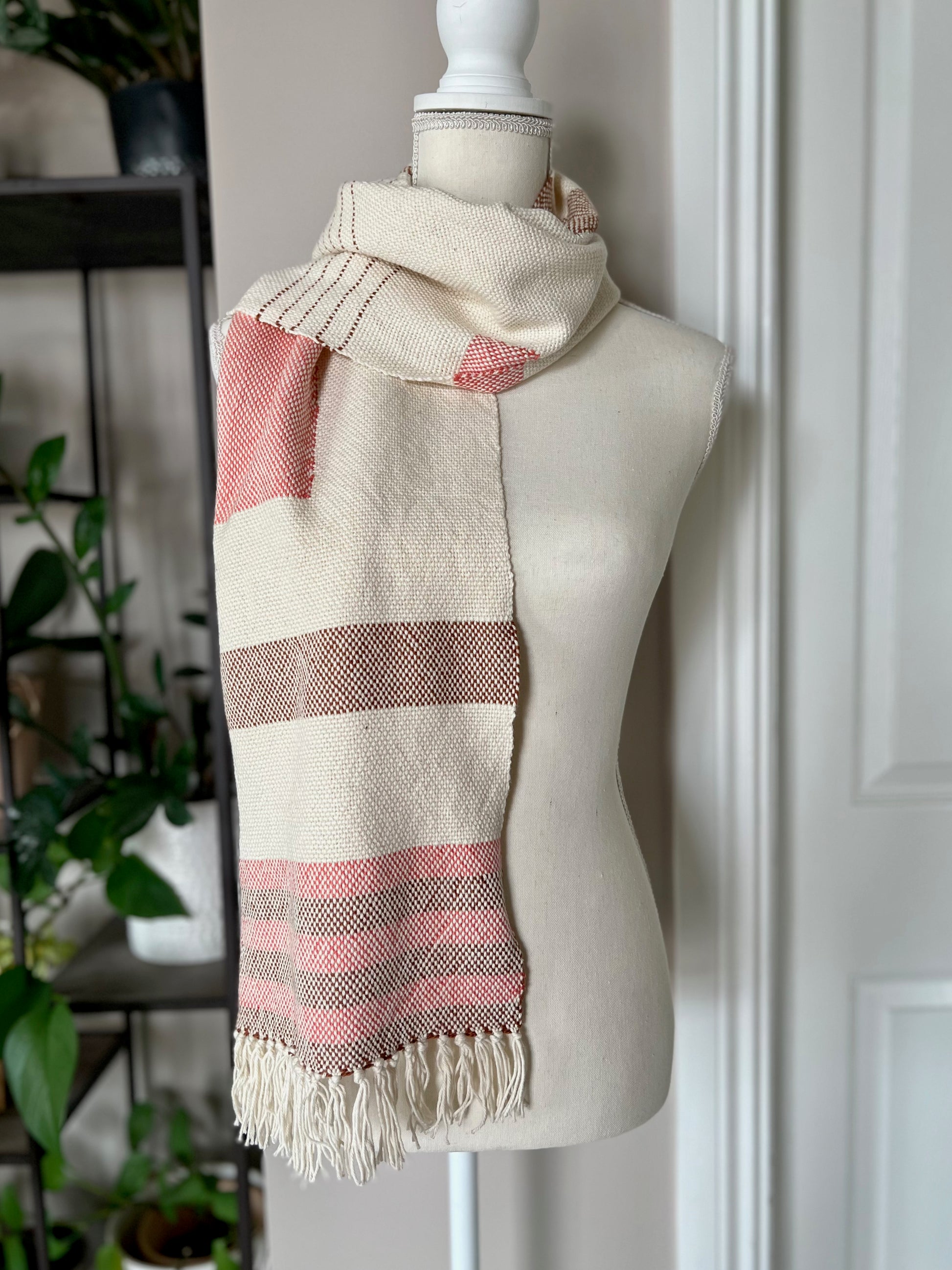 This scarf is crafted from 100% Organic Cotton, providing a lightweight and comfortable feel that is perfect for all seasons. Its soft drape and cream hue make this piece truly unique, as it was handwoven with an interlocking weft method, patterned with copper and coral squares, stripes, and blocks for a modern, geometric aesthetic.