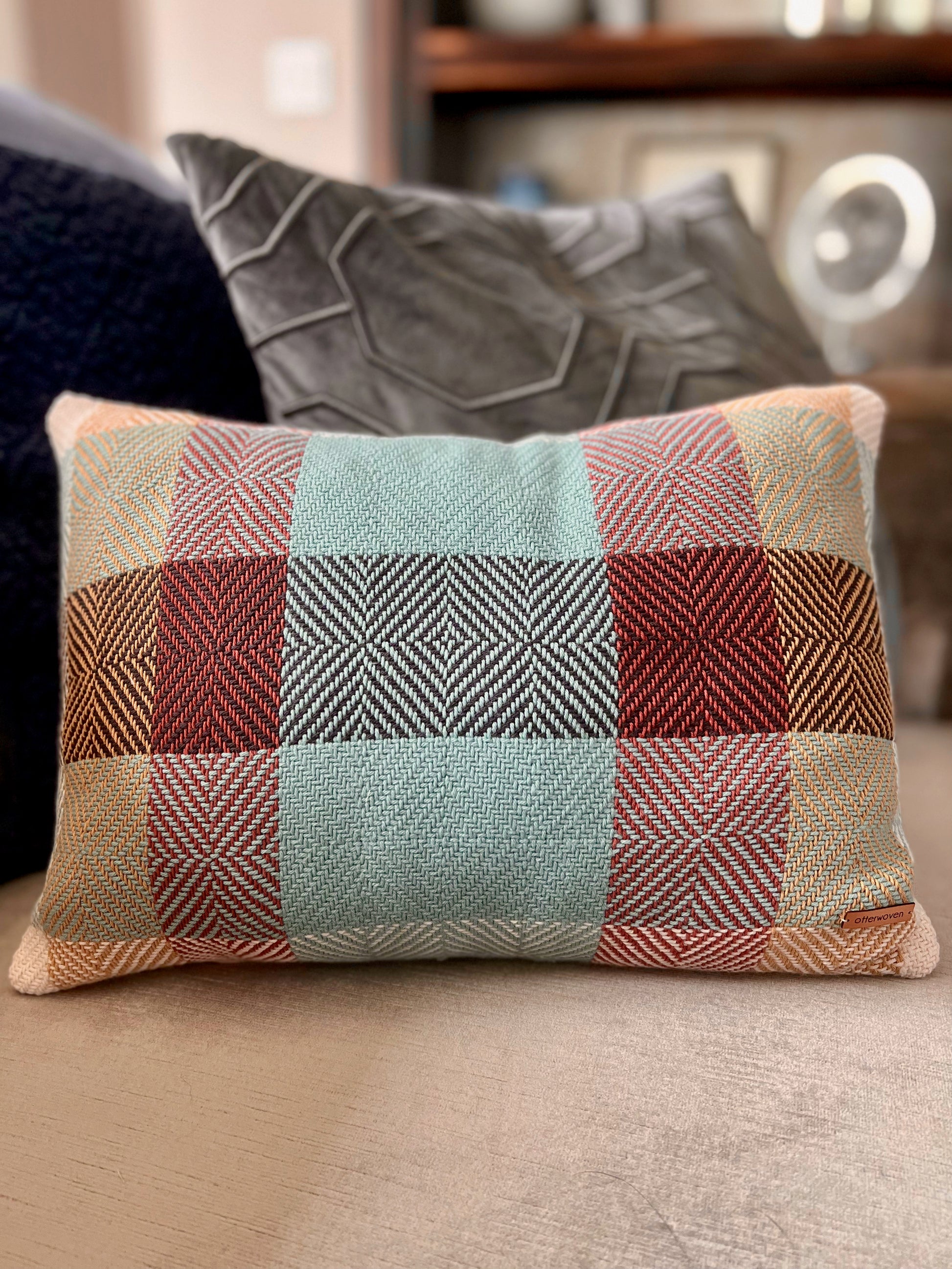 Our Farmhouse Accent Pillow brings a relaxed, vintage feel to any room with a soft mix of cream, aqua, brick red and a touch of gold. This 12" X 16" pillow is handwoven in a diamond twill checkered pattern using 100% natural cotton and backed with a solid natural linen fabric. Envelope closure. Includes pillow cover and form. Leather logo tag.