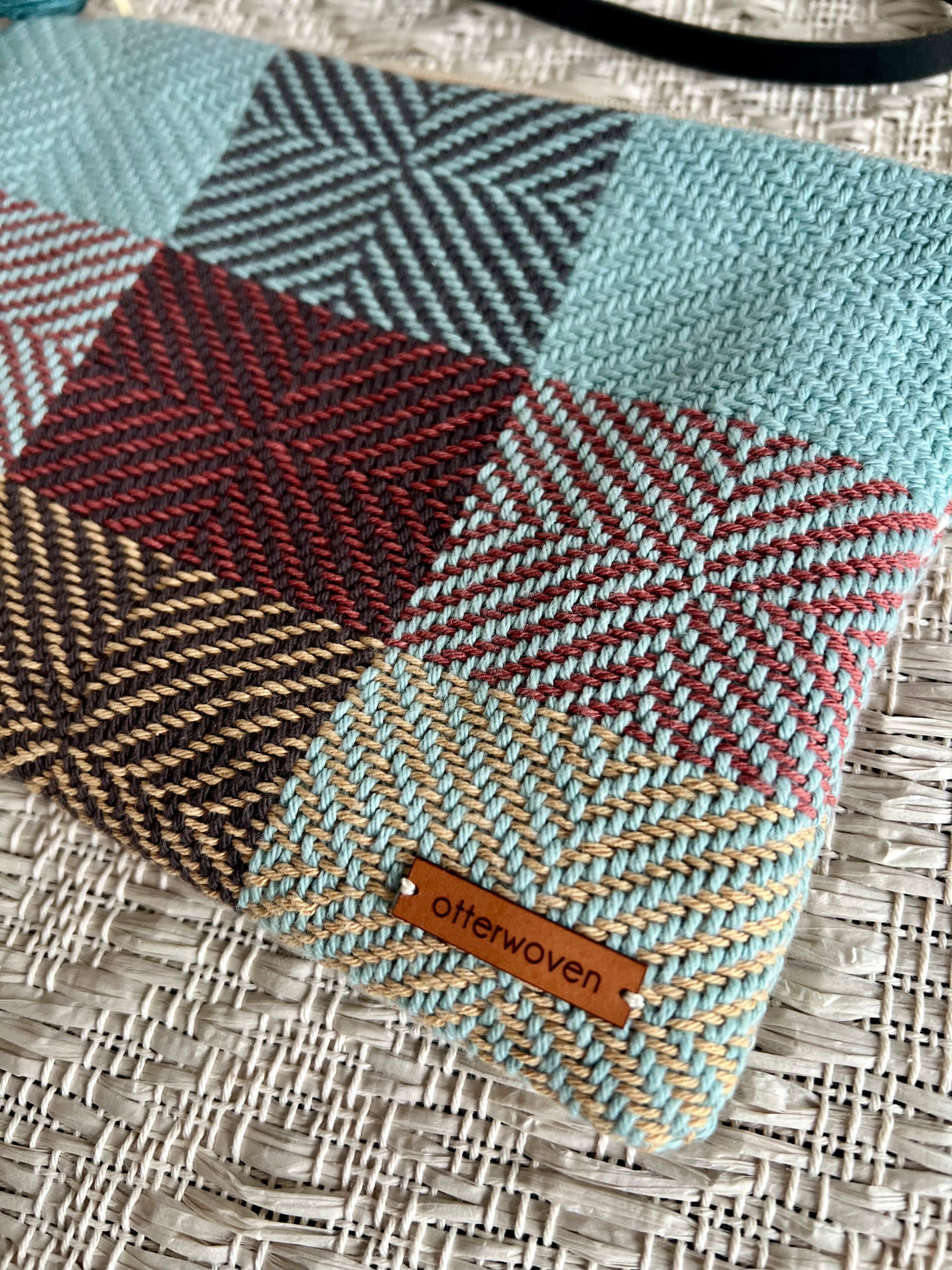 Handwoven on my 4-shaft floor loom, Framework began as a study in point twill - exploring how directional changes in weave structure can create clean, rhythmic blocks of color. With a palette of soft blue, rust, charcoal, and gold, the cloth balances clarity and warmth. Each block shifts gently in tone and twill direction, giving the piece quiet movement and tactile nuance. Bold in form yet soft in hand, it’s a meditation on how structure and color shape each other.
