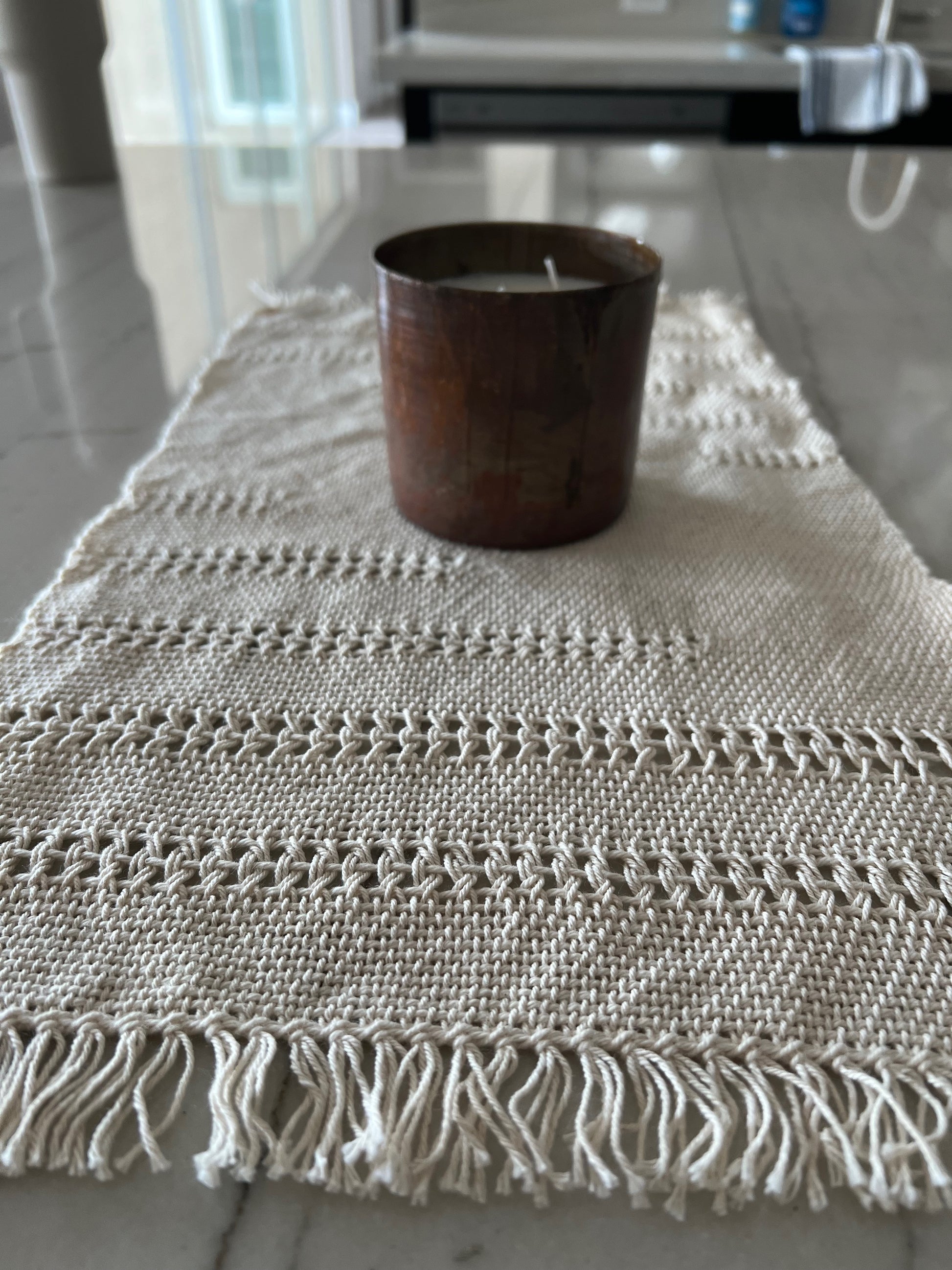 This Leno Table Mat is an exquisite addition to a coastal bohemian tablescape. It is expertly woven with 100% organic cotton, showcasing delicate leno lace detailing, and measures 10-1/4" x 17" plus a 2" fringe. Suitable for a centerpiece or small accent and console tables.