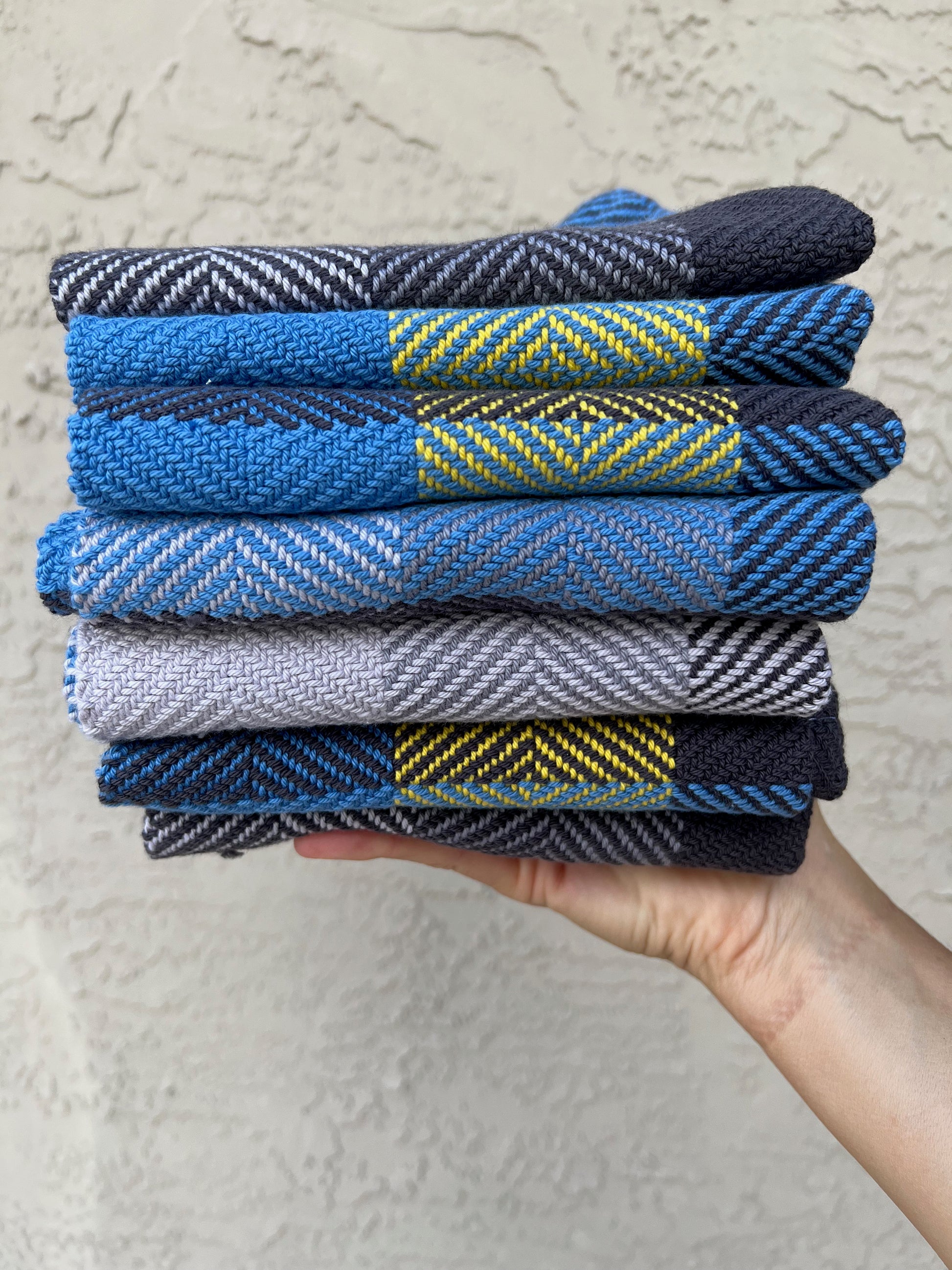 The Macaw Twill Checked collection features towels that color coordinate but each features a different pattern. The color mix was inspired by the Blue and Gold Macaw, and includes bright blue, yellow and greys. Whether you use them in the kitchen for drying dishes or as hand towels, line your bread basket with them, or display them on a towel rack, these sturdy towels are unique, colorful and will brighten your space.