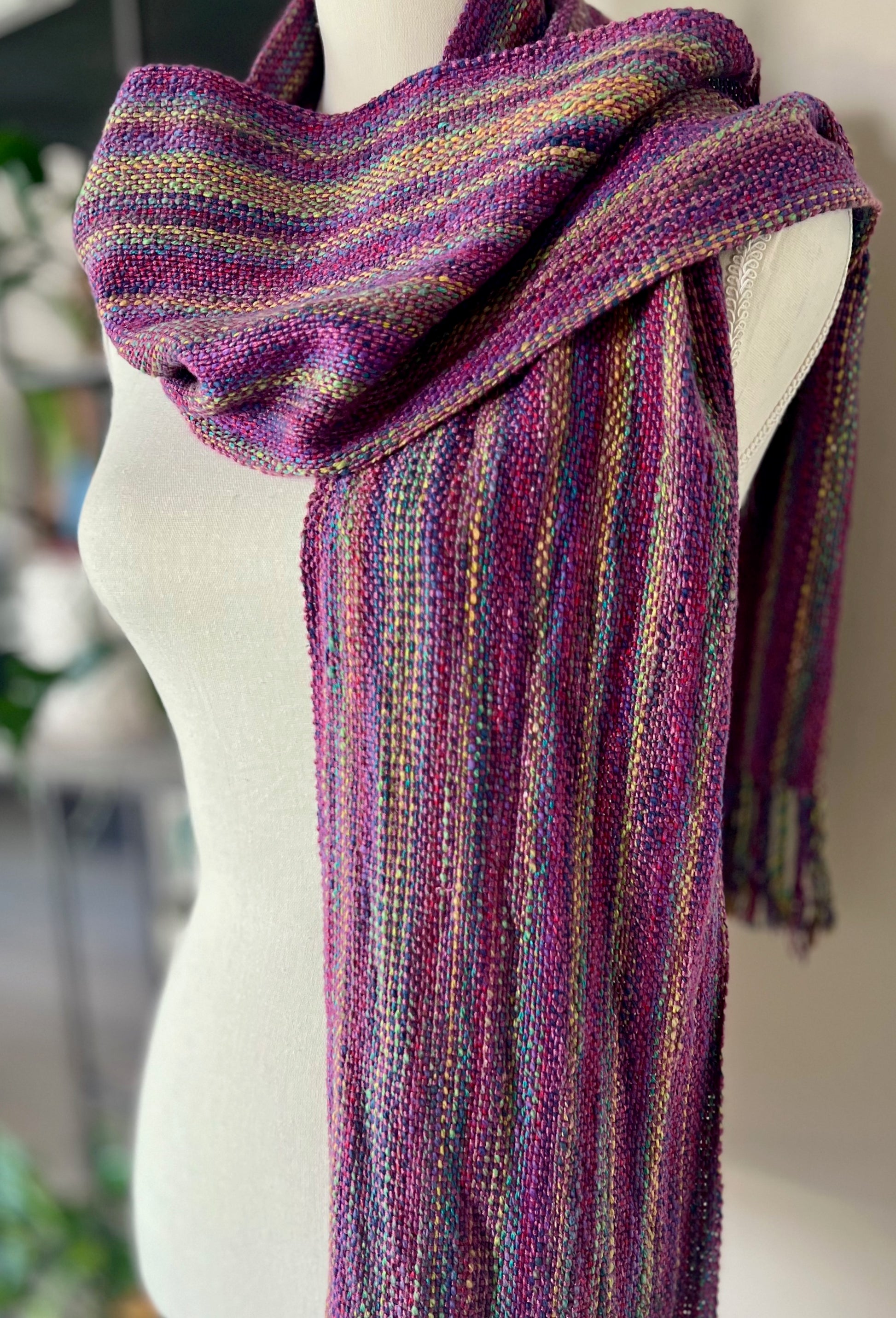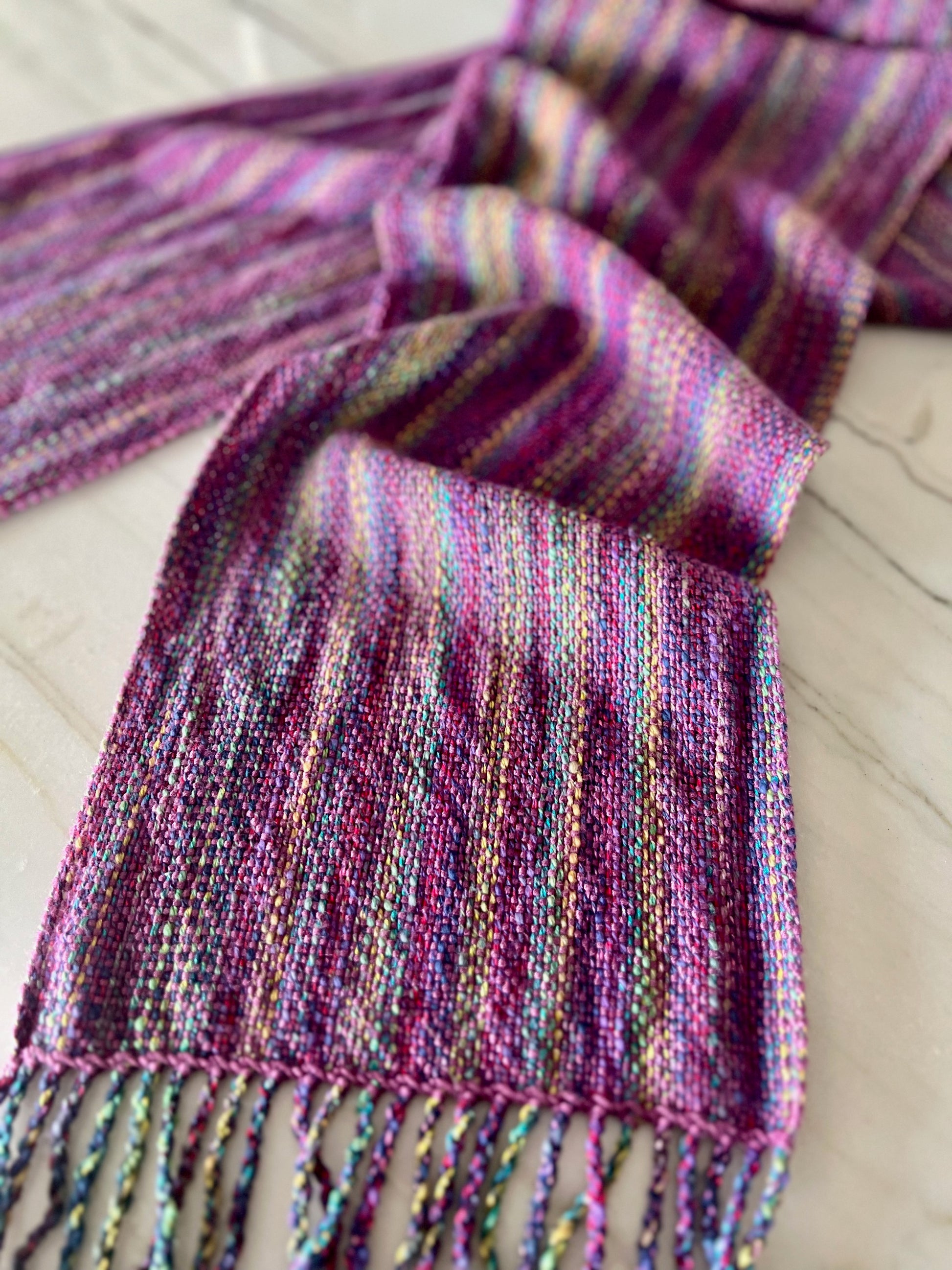 The Mystic Mulberry Bamboo Scarf features a unique blend of rainbow hues and a gorgeous mulberry mauve in a subtle striped design. Handwoven using a high-quality Italian cotton and acrylic blend, as well as luxurious bamboo, this one-of-a-kind scarf is both lightweight and incredibly soft. It is the perfect accessory to add a touch of color and style to any outfit.
