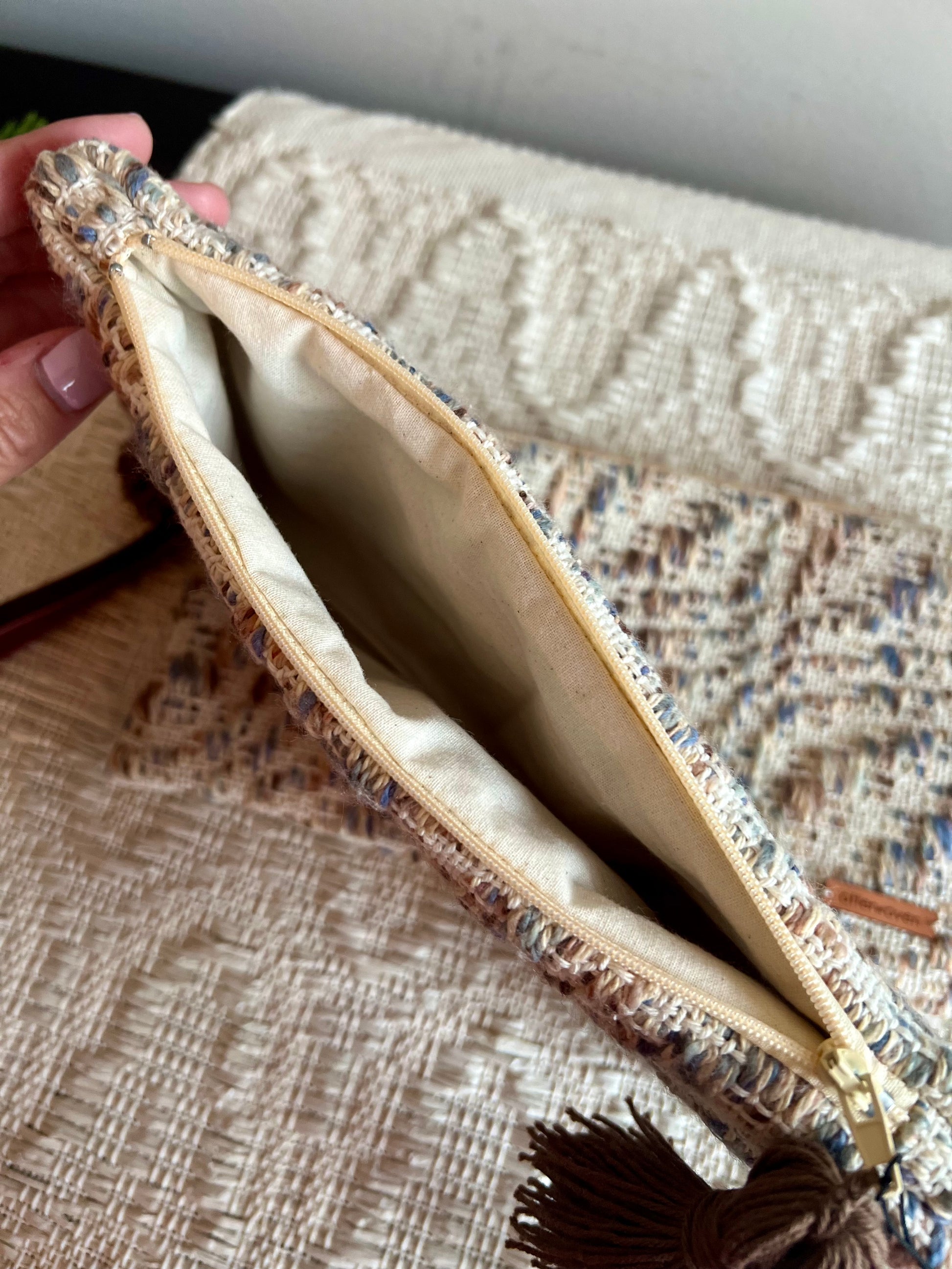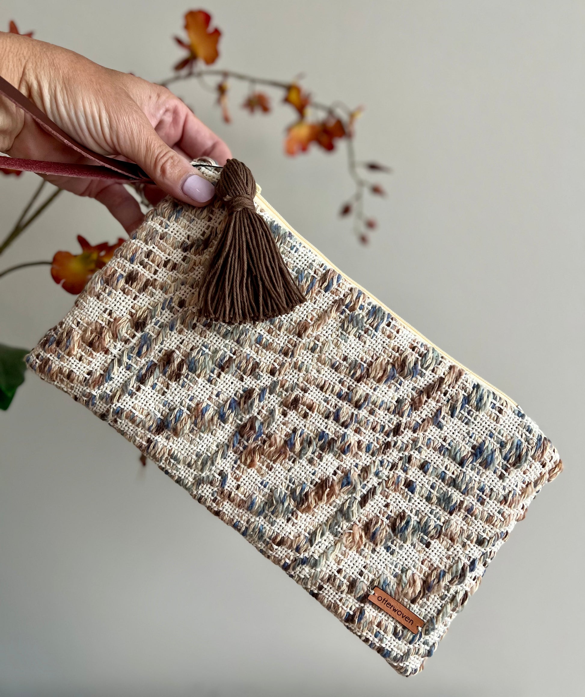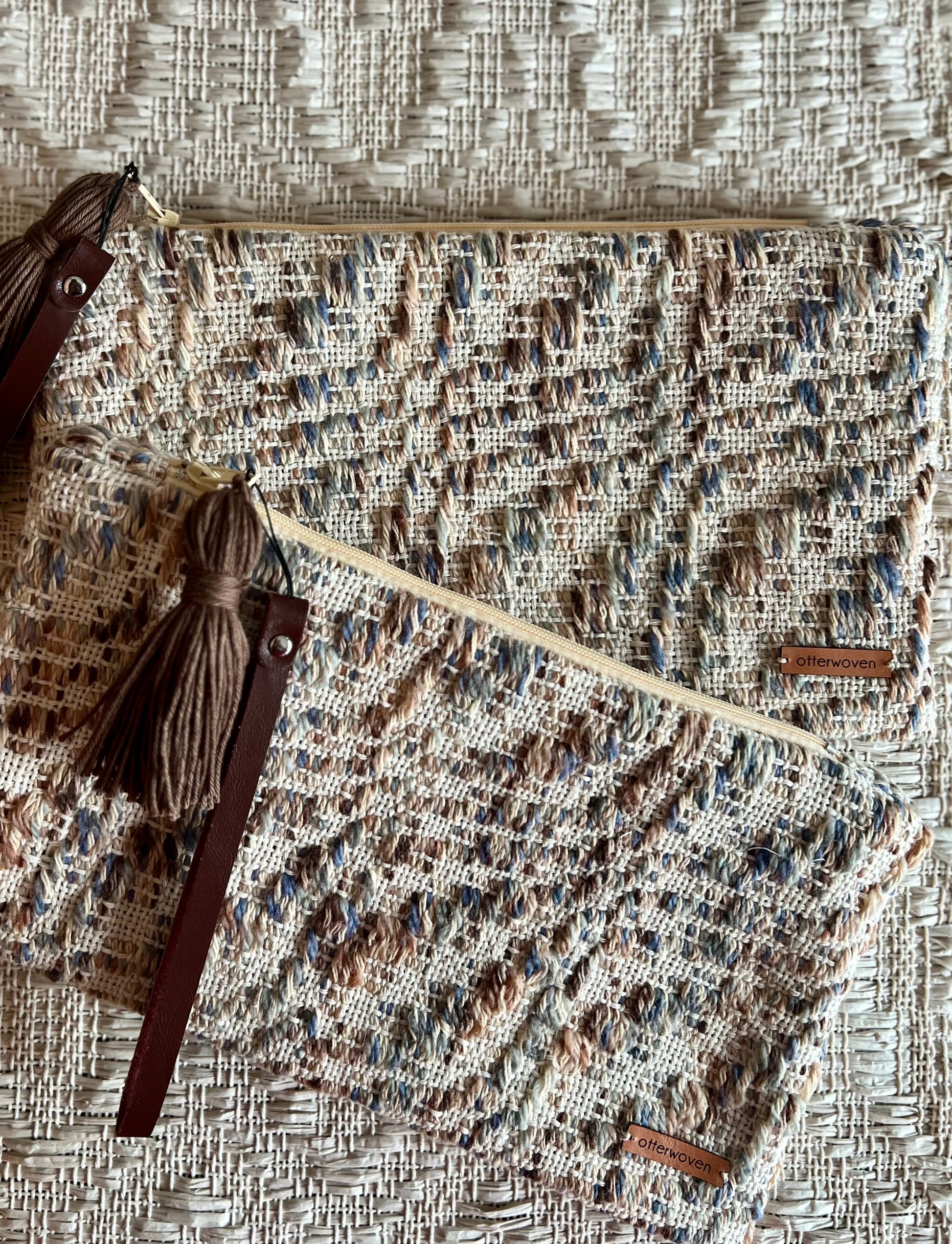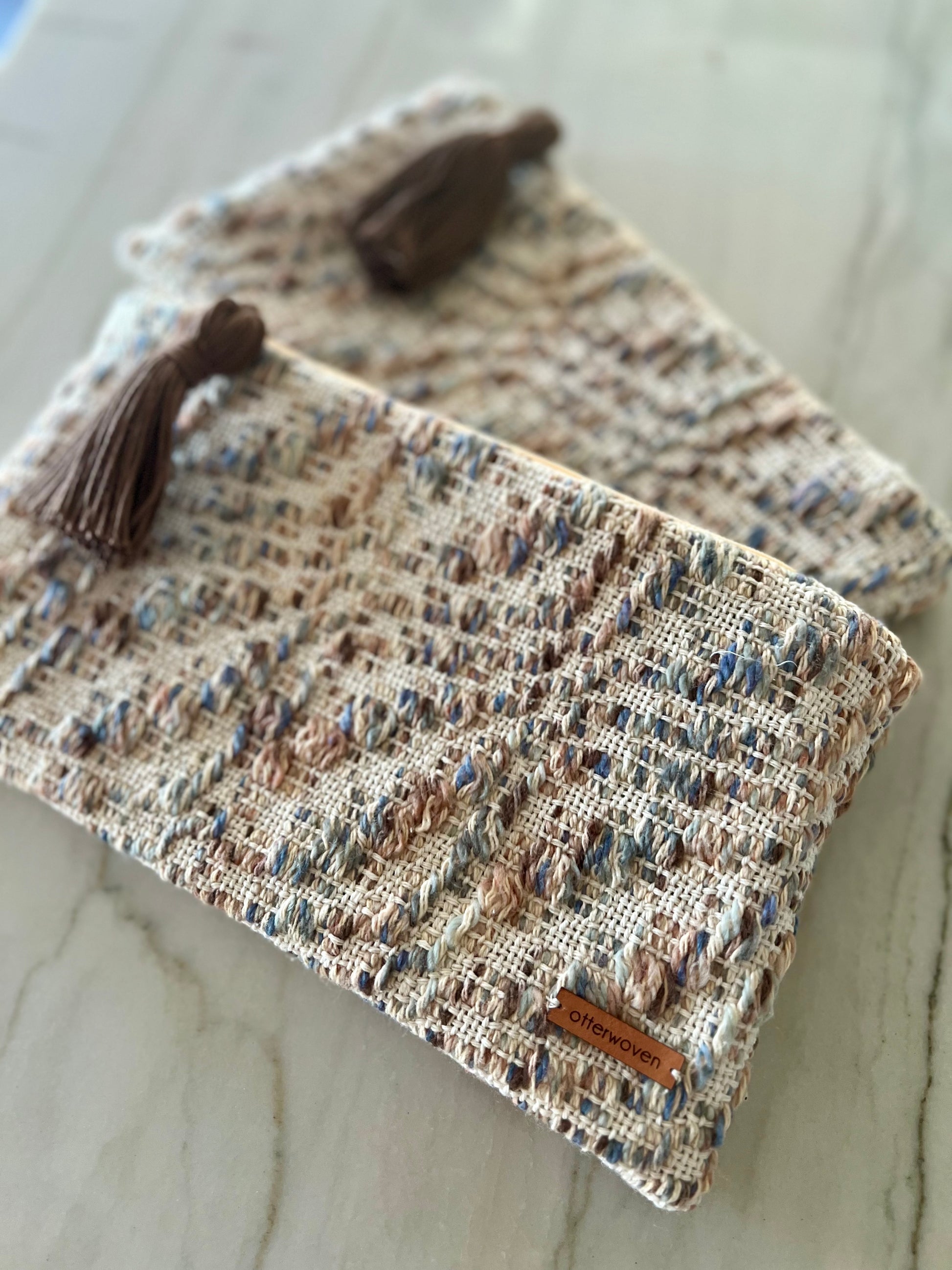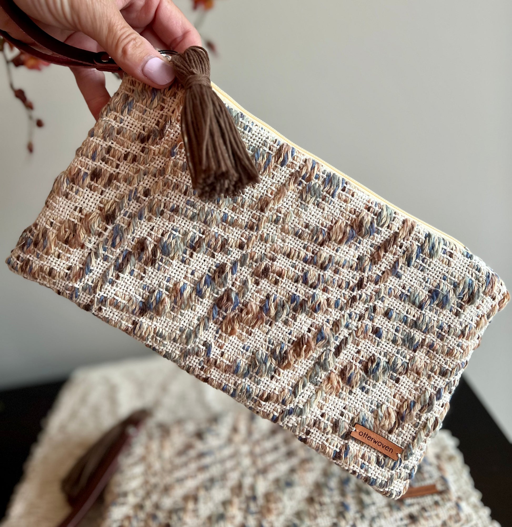 Fully lined with natural cotton, Overlook features an 8" zipper closure with a handmade tassel pull and a genuine leather wrist strap for added ease, along with an Otterwoven hand-sewn leather tag. Machine sewn with care to preserve the integrity of the handwoven cloth, it’s designed to hold your essentials while honoring its handmade origin.
