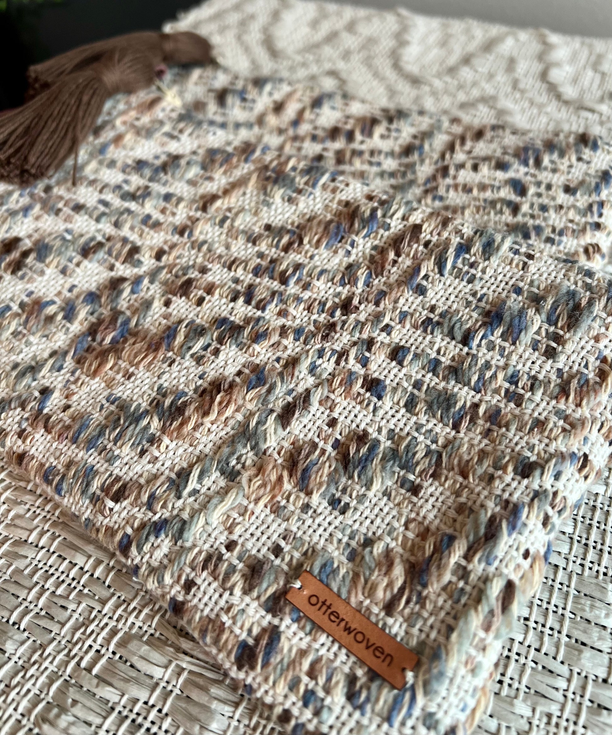 Handwoven on my 4-shaft floor loom, Overlook began as a study in undulating twill - an exploration of how line and rhythm emerge from structure. The cloth blends a natural cotton warp with a variegated weft in cream, brown, soft sage, and pale blue, giving the pattern a grounded, almost topographic feel. Each curve in the weave echoes the subtle rise and fall of the landscape - rhythmic, organic, quietly expressive.