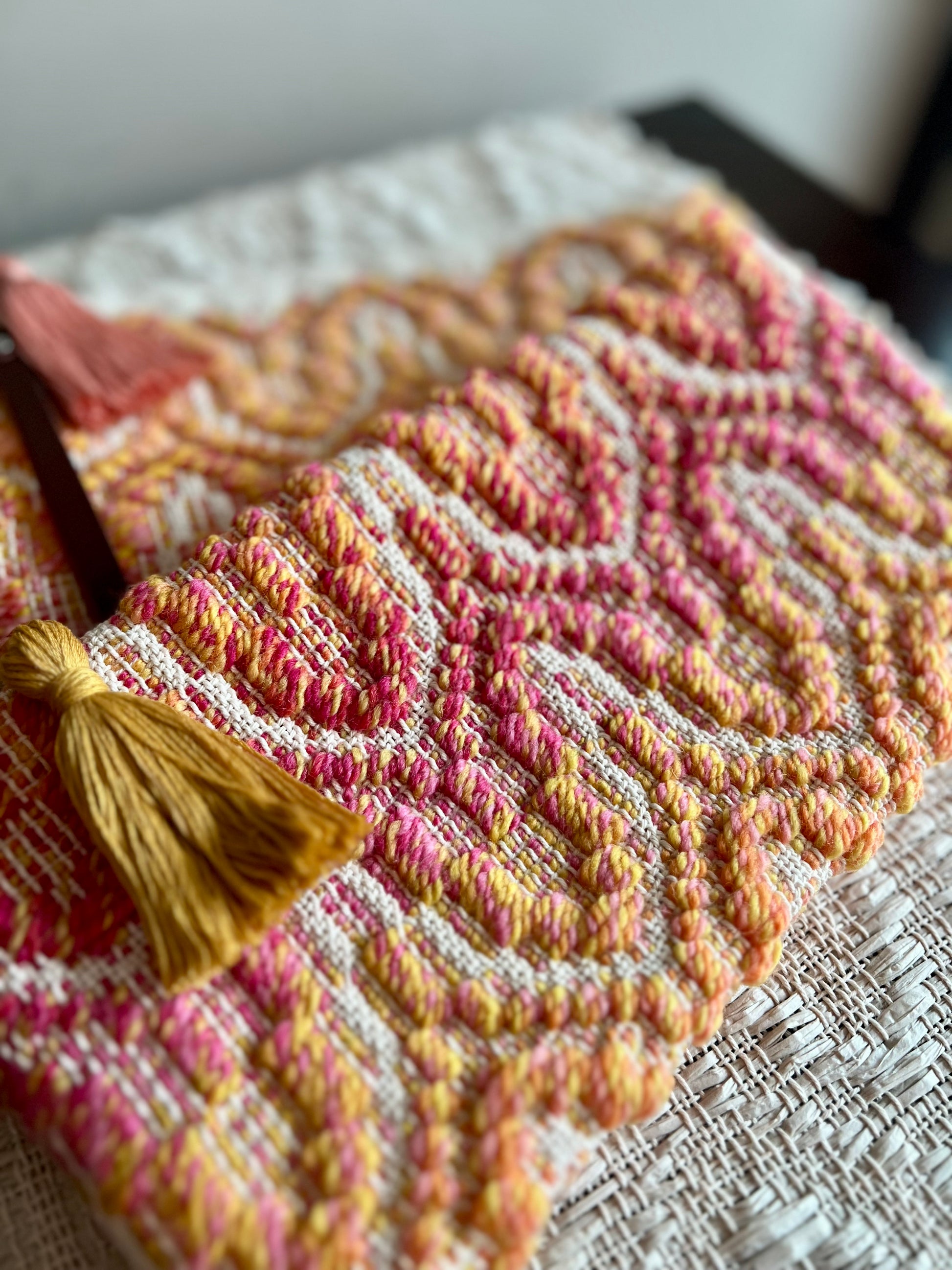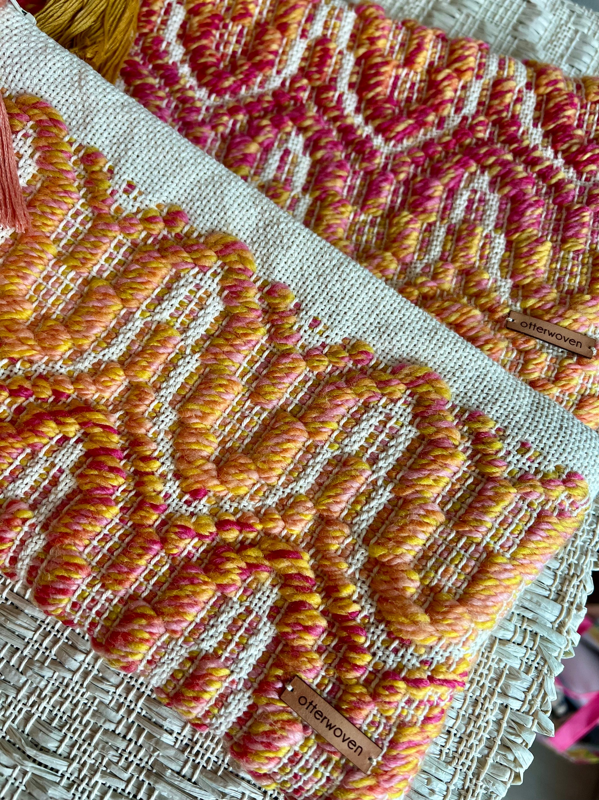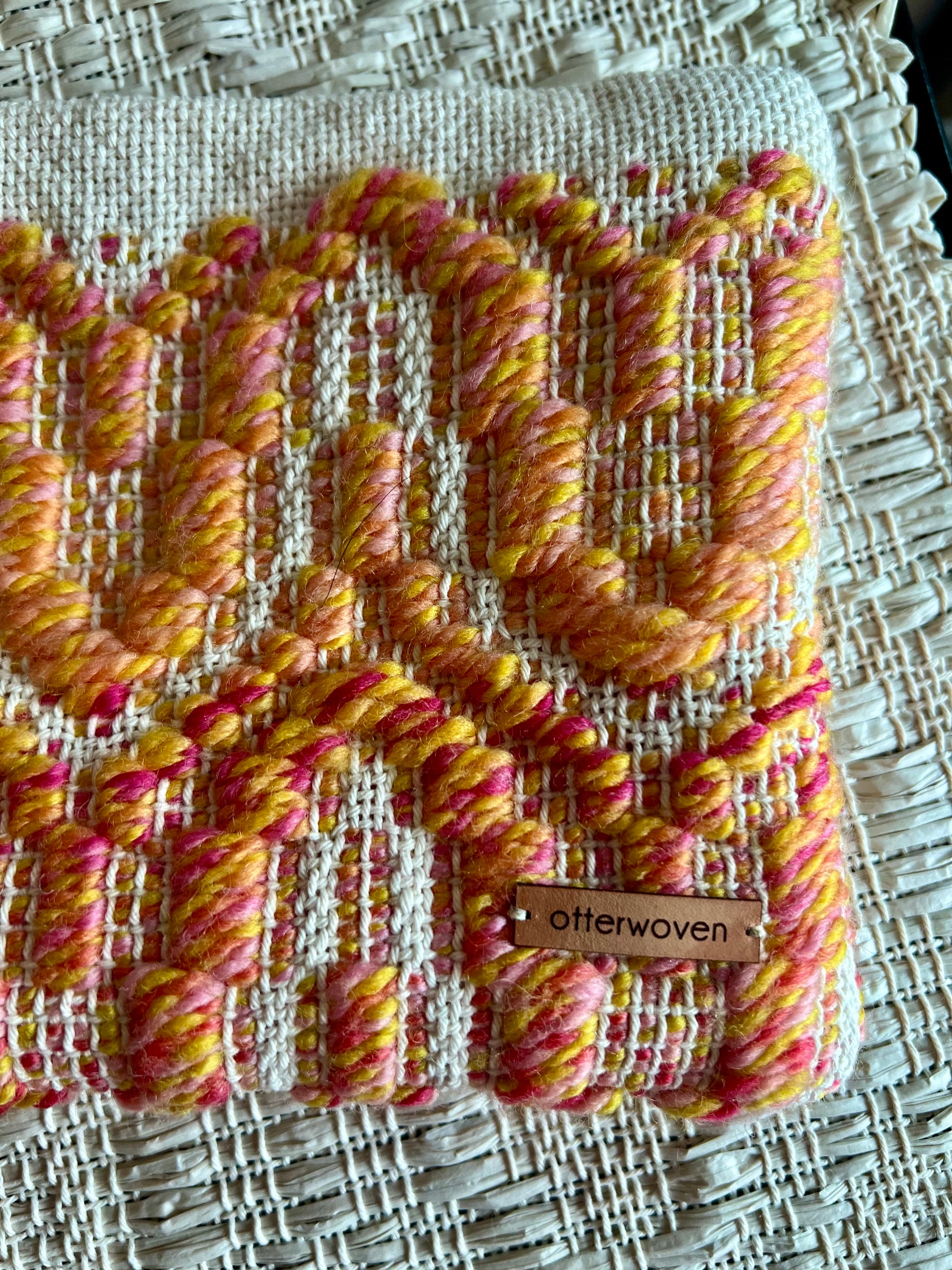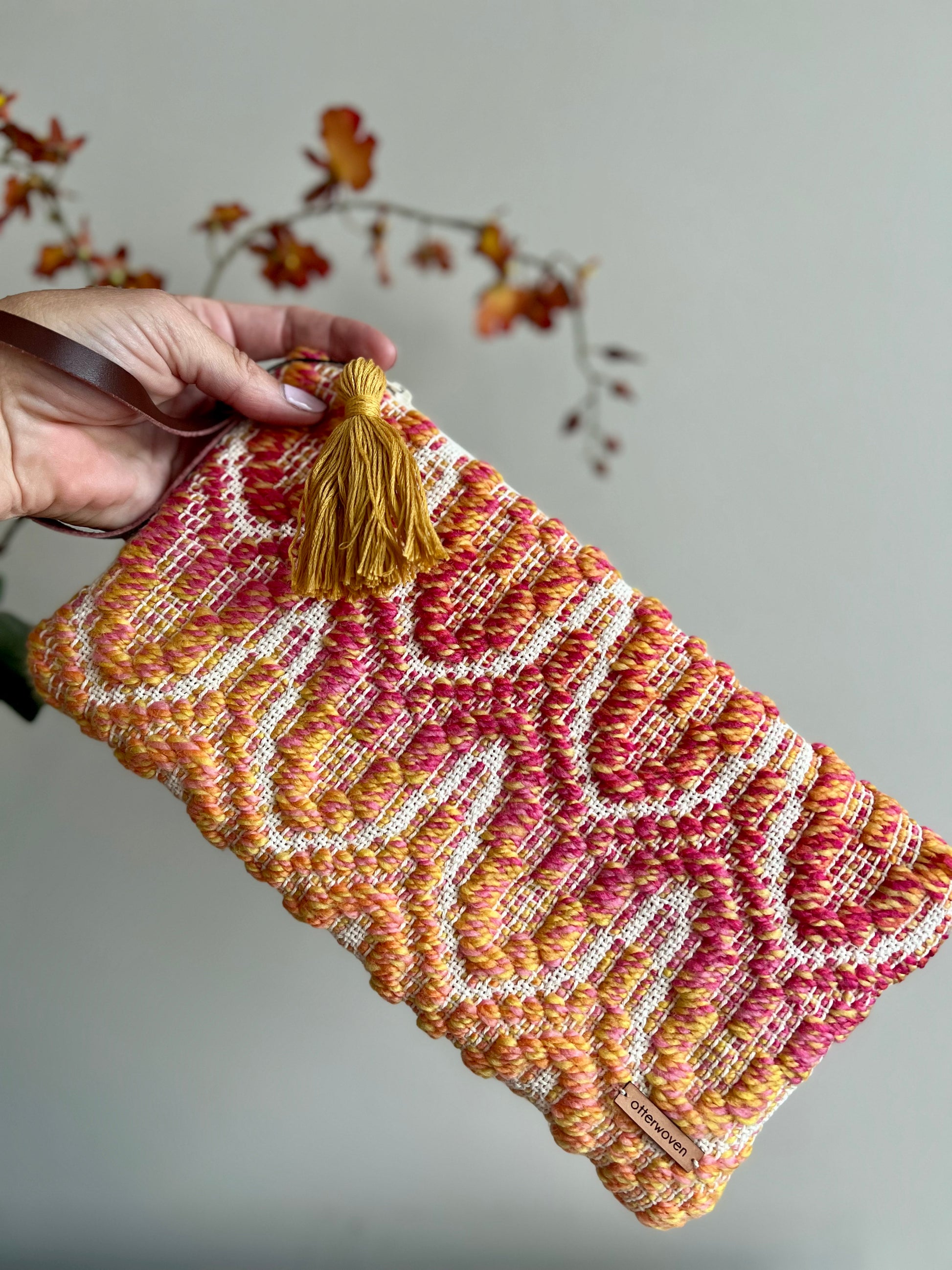 Handwoven on my 8-shaft floor loom, Punchline began as a structural study in overshot - a wavy-line motif made even more expressive with a thick, variegated wool yarn in brilliant yellows, oranges, peaches and pinks. The cloth (and resulting clutch) is unapologetically bold: high-contrast, plump to the touch, and full of spontaneous color interplay. Each overshot curve ripples across the surface like a punchy waveform - graphic, rhythmic, and full of life - sure to add a pop of color and pizazz to your outfit.