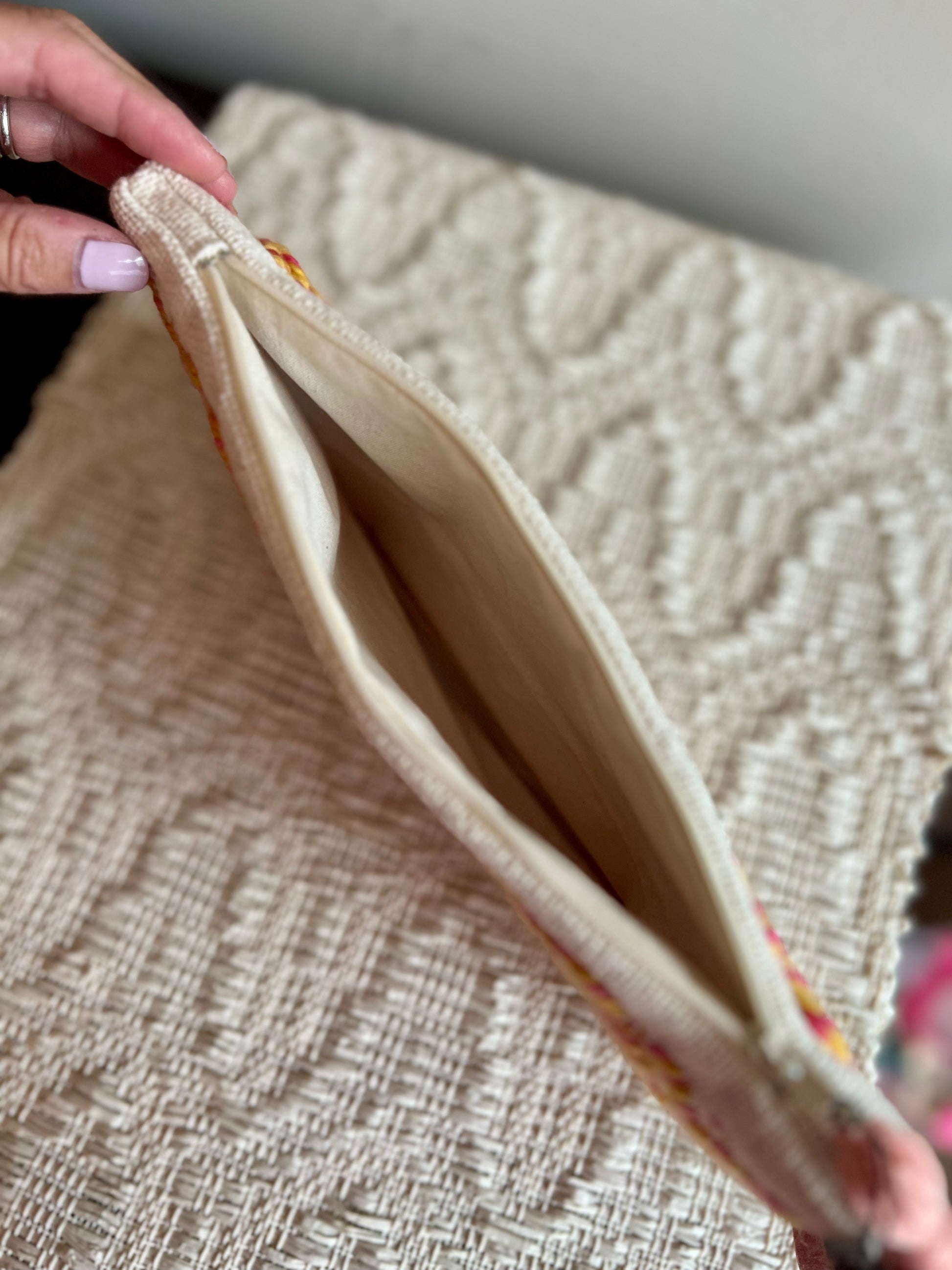 Fully lined with natural cotton, Punchline features an 9" zipper closure with a handmade tassel pull and a genuine leather wrist strap for added ease, along with an Otterwoven hand-sewn leather tag. Machine sewn with care to preserve the integrity of the handwoven cloth, it’s designed to hold your essentials while honoring its handmade origin.