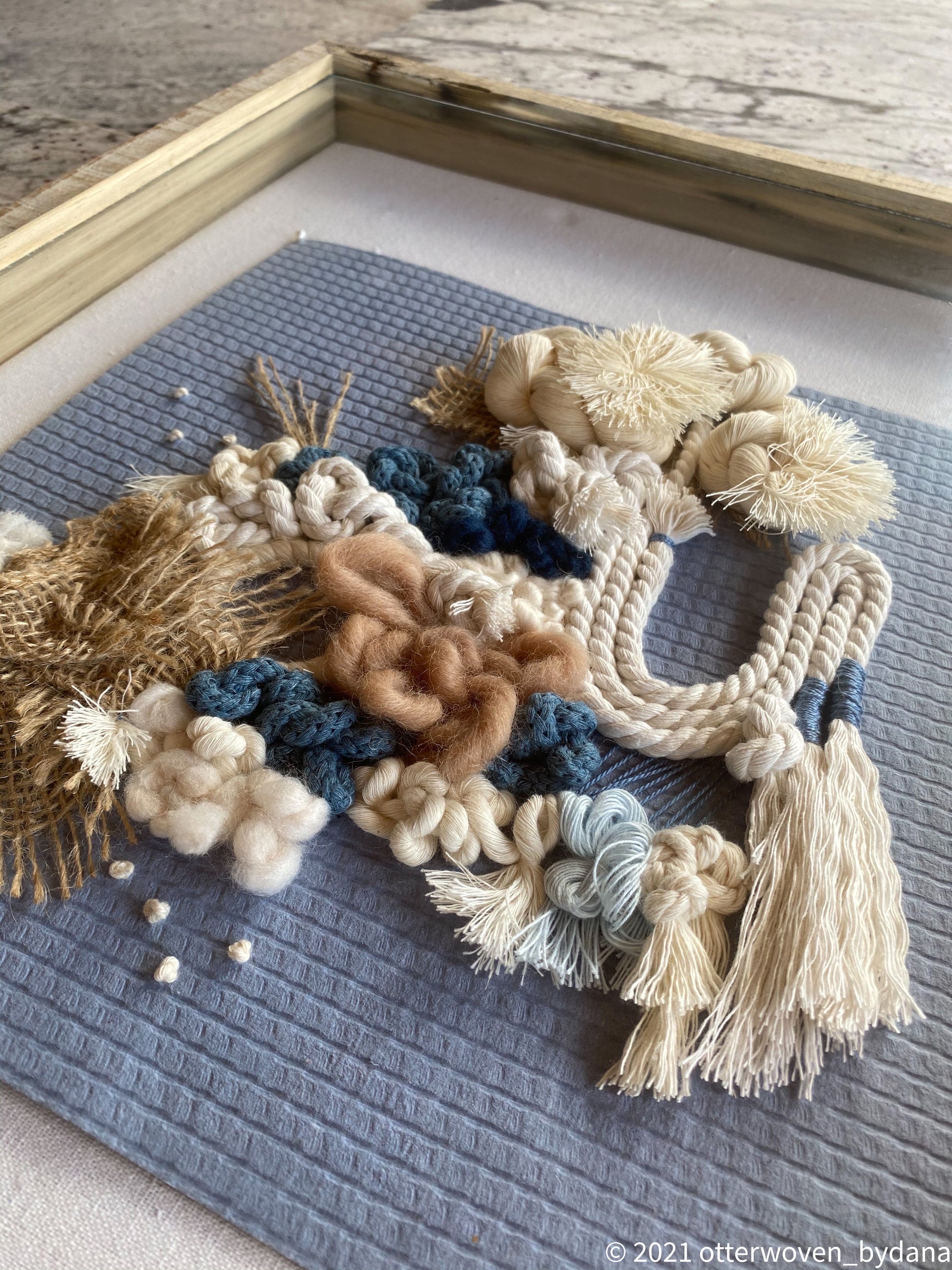 This unique embroidered tapestry is a twist on OTTERWOVEN's signature style. Featuring a driftwood shadowbox frame, this piece was handmade with a mixture of fibers including wool, organic cotton string and rope in shades of cream, blue and tan. Mounted on a subtle cornflower blue textured cardstock, it showcases a variety of textures, evoking coastal and beach vibes. A perfect one-of-a-kind statement piece for your home.
