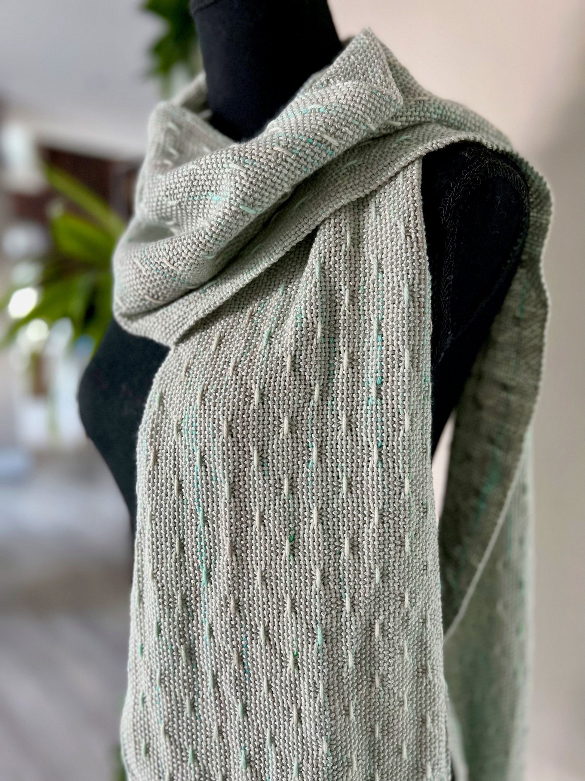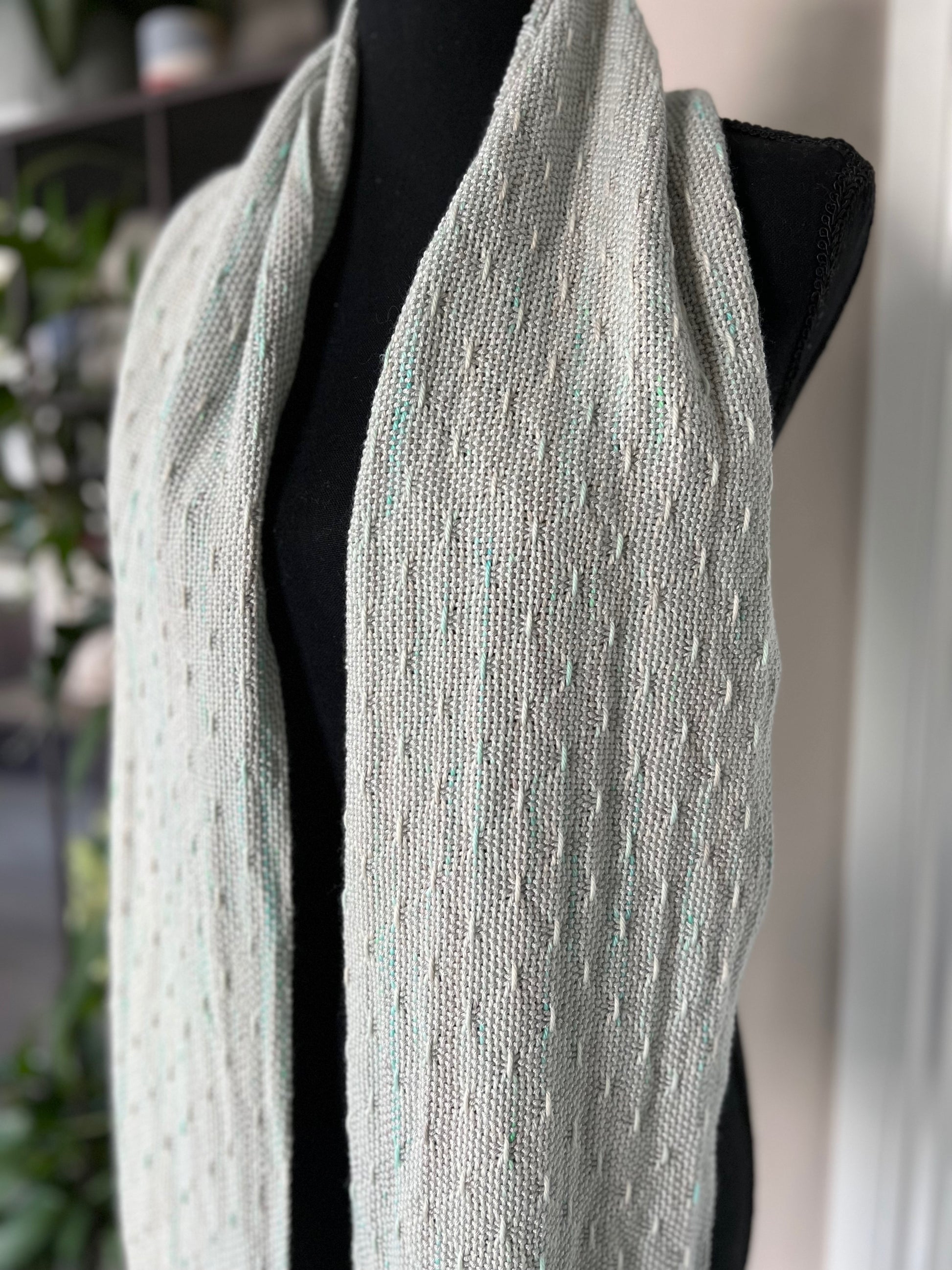 Luxuriously soft and elegant, with a gorgeous drape, this lightweight cotton/merino wool and pima cotton/bamboo handwoven scarf features a subtle stripe and textured pattern. Warp colors ranging from soft mint and light grey to cream are complimented by a soft grey weft. This scarf was woven with a one of a kind superwash wool and cotton blend, which was hand-dyed by another small maker from Sarasota, Florida.