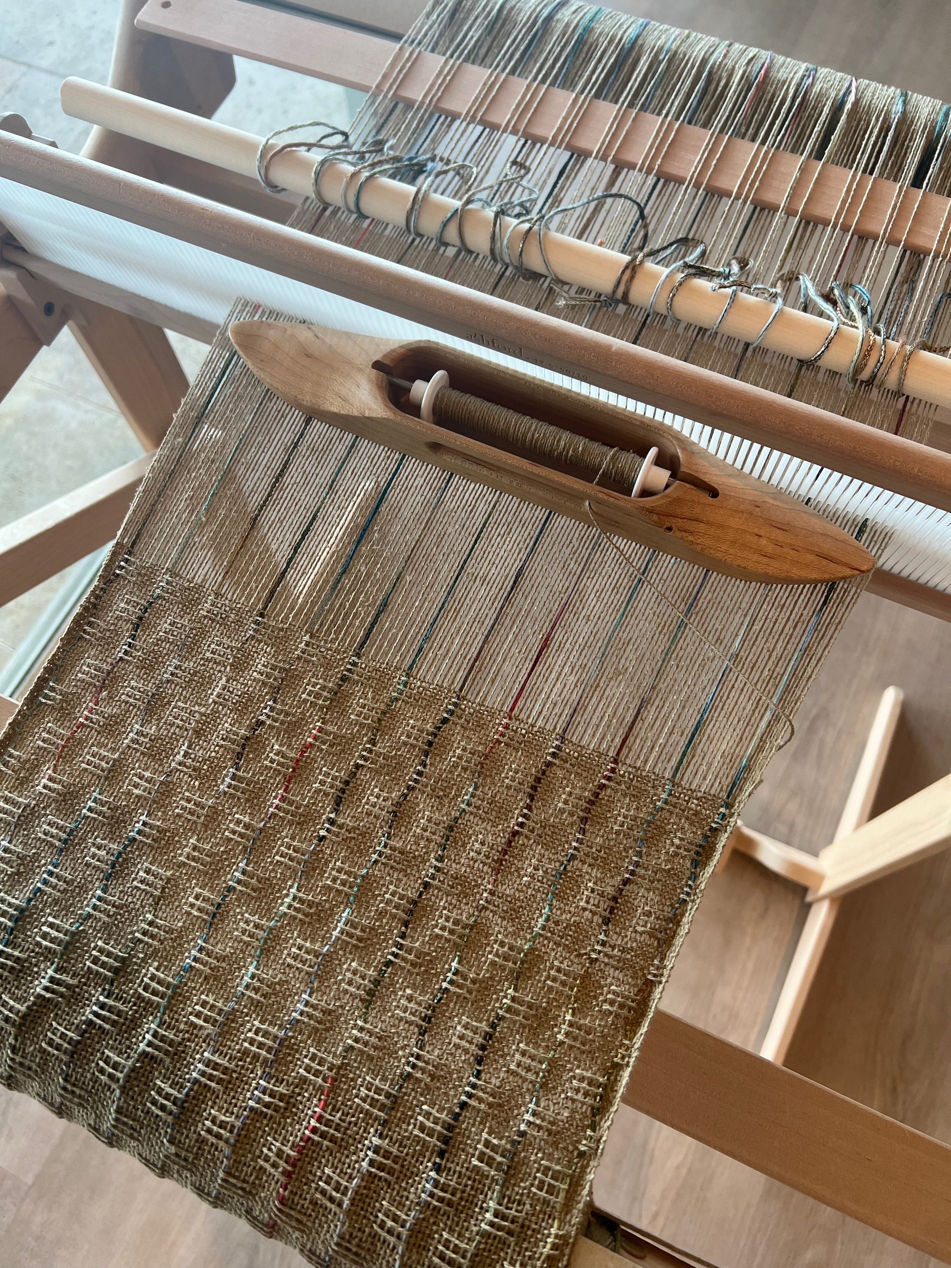 Crafted by textile artist Dana Lutz on a rigid heddle loom, this versatile silk noil scarf is a luxurious addition to any wardrobe. Its lightweight texture and graceful draping are enhanced by delicate "waves" and floats that elegantly dance along the length of the garment. With its classic neutral khaki color and subtle pops of hue, this one-of-a-kind piece can easily elevate any outfit. Add this timeless and unique work of wearable art to your collection and enjoy its beauty for years to come.