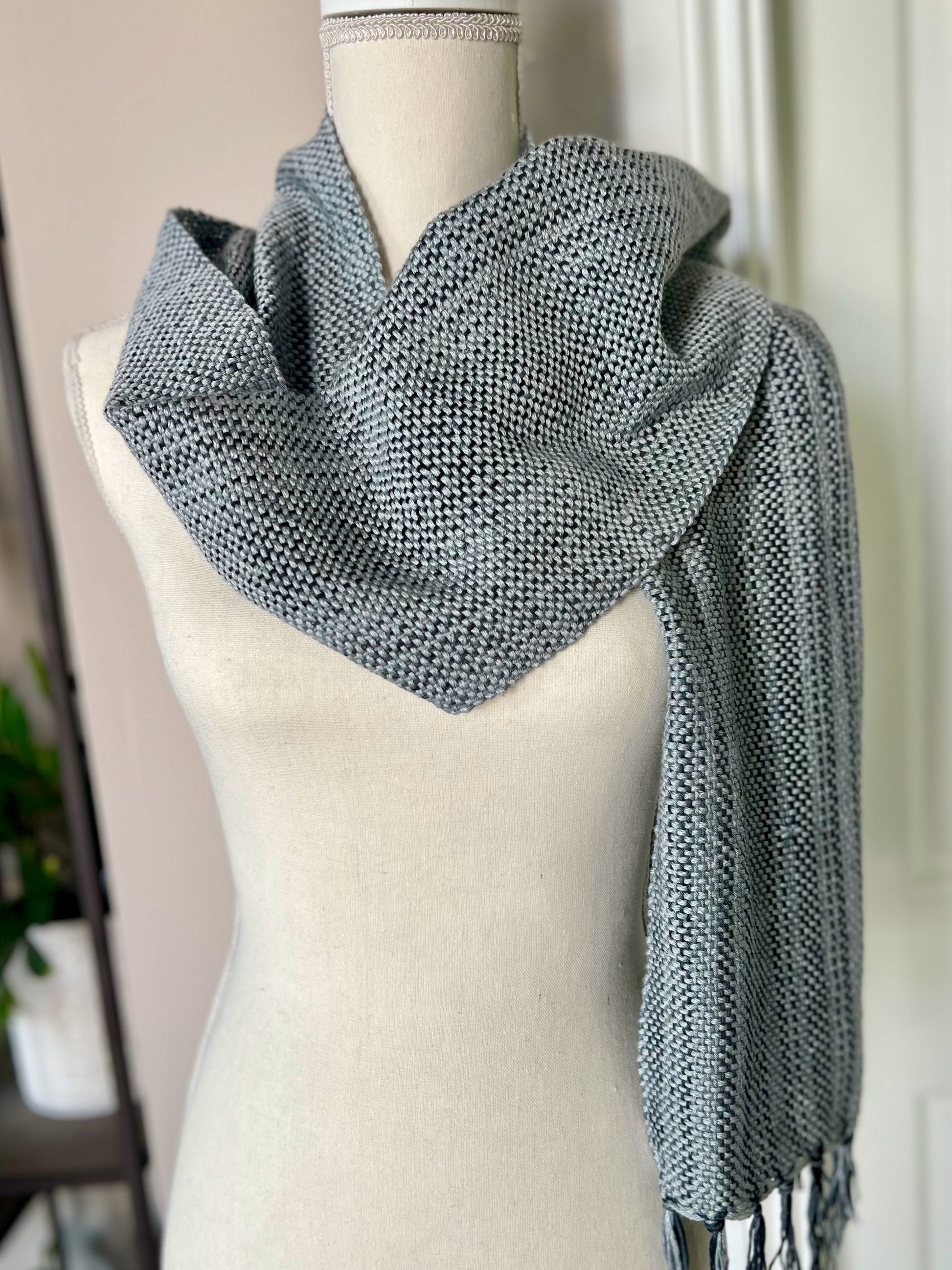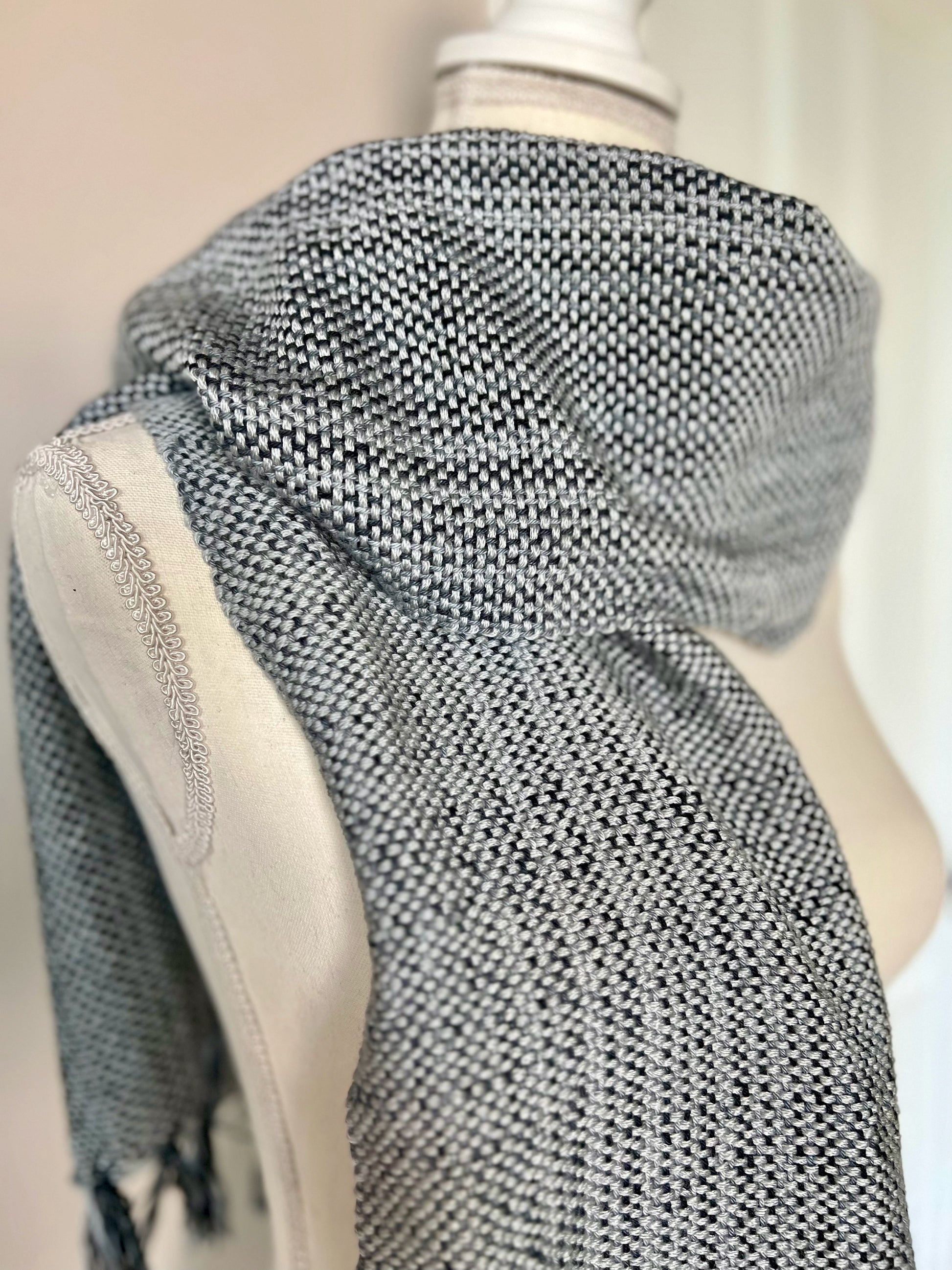 This Silver Bells Cotton Scarf is an essential piece to add to your wardrobe. This beautiful silver scarf boasts a subtle stripe pattern of black, grey and silver shades, the hand-dyed cotton yarn offers a lightweight and comfortable finish with a cozy feel. This festive cotton scarf adds a touch of style to any ensemble. Perfect for holiday parties and NYE!