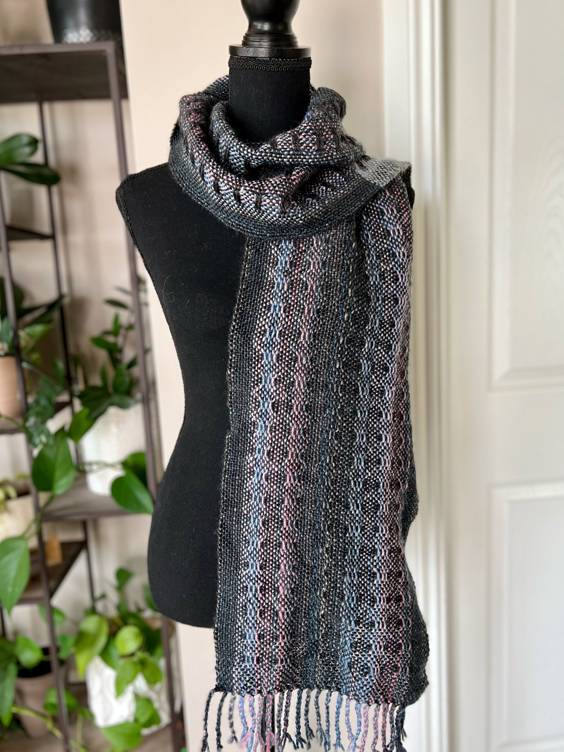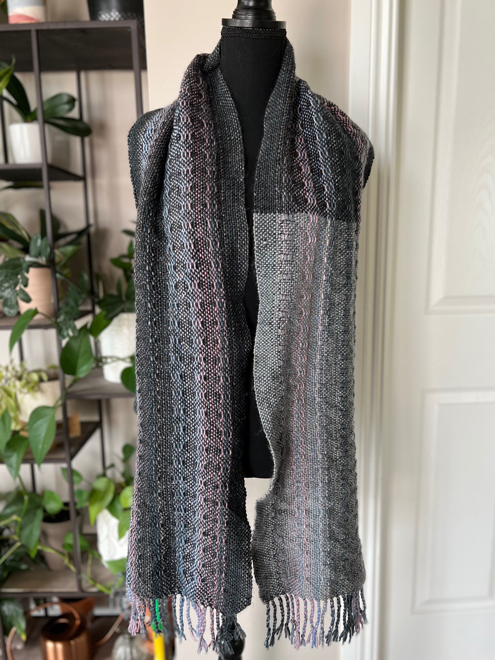 Edgy and modern, our handwoven Skyline scarf is the perfect way to stay warm during a cool day outdoors or a fun evening out. This one-of-a-kind handmade 100% acrylic scarf is soft, plush and and yet breathable and lightweight. Beautiful details include a charcoal and grey color block, with a subtle striped pattern with a unique textured surface and 3" long hand-twisted fringe, showcasing the charcoal grey, pink and blue fibers. Measures approximately 11" x 73" without fringe.